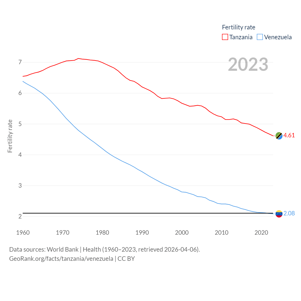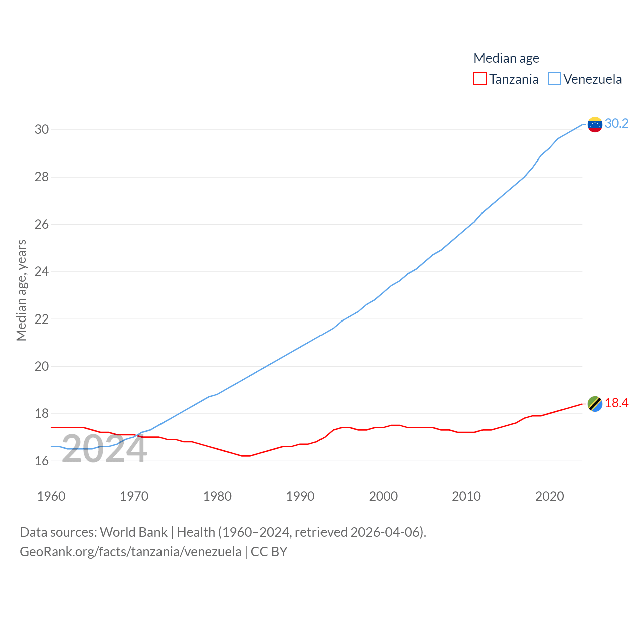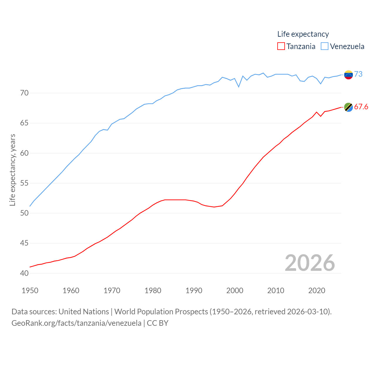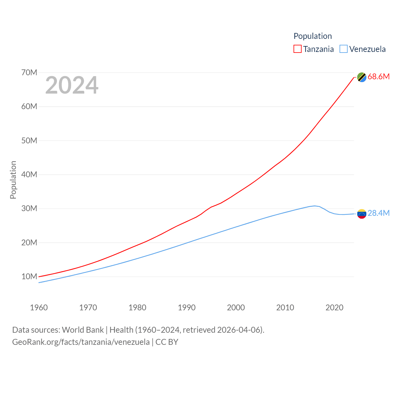 Tanzania has a population of 68.6M (ranked 22/197), compared with 28.4M in Venezuela (ranked 53/197). Tanzania's land area is 342,009 sq mi versus 340,561 sq mi for Venezuela (ranked 31st vs. 32nd).