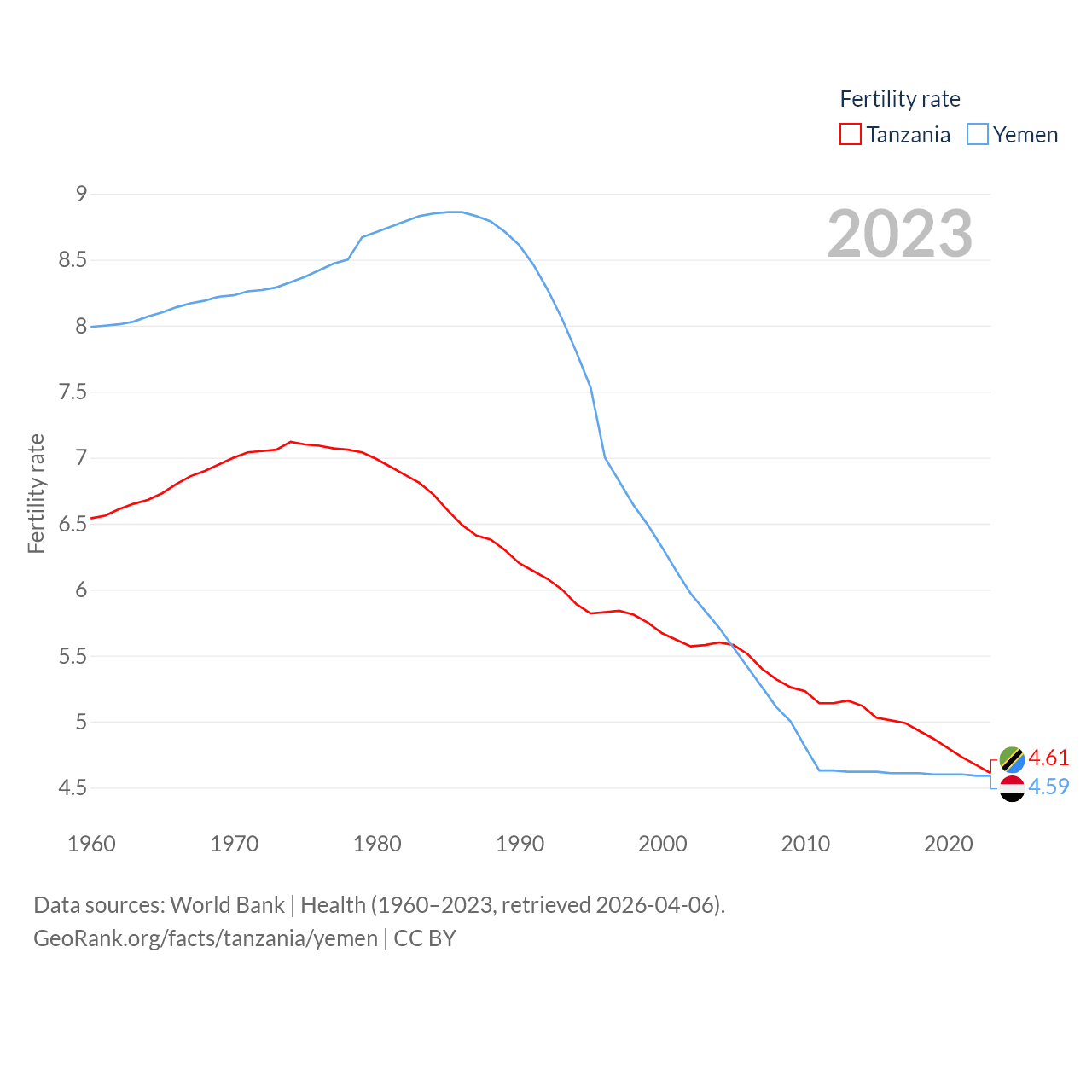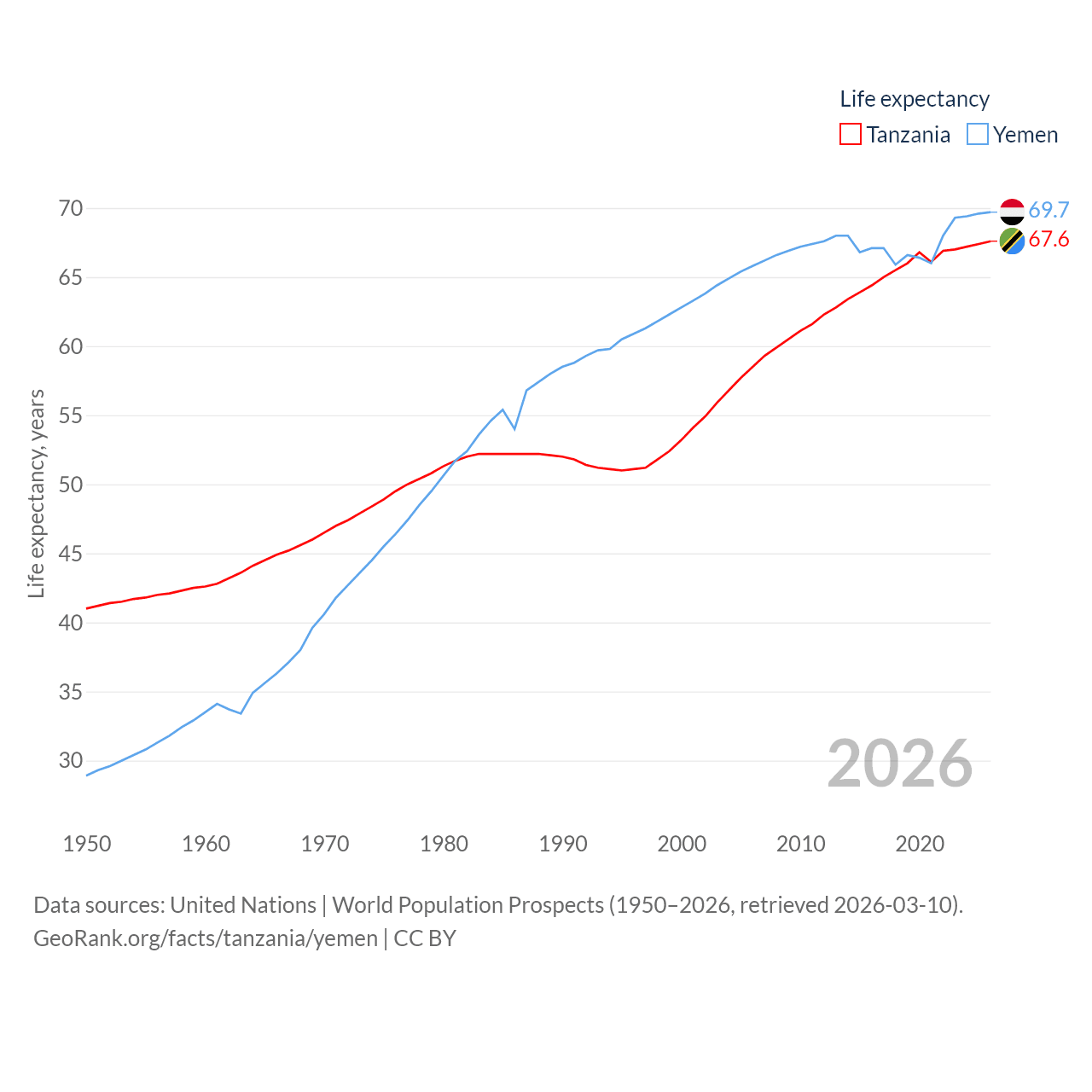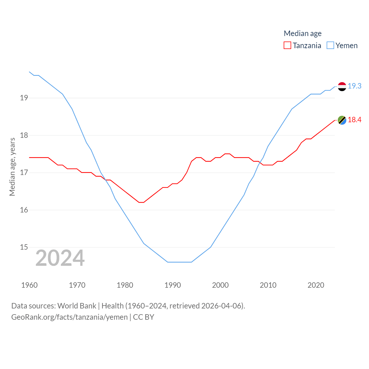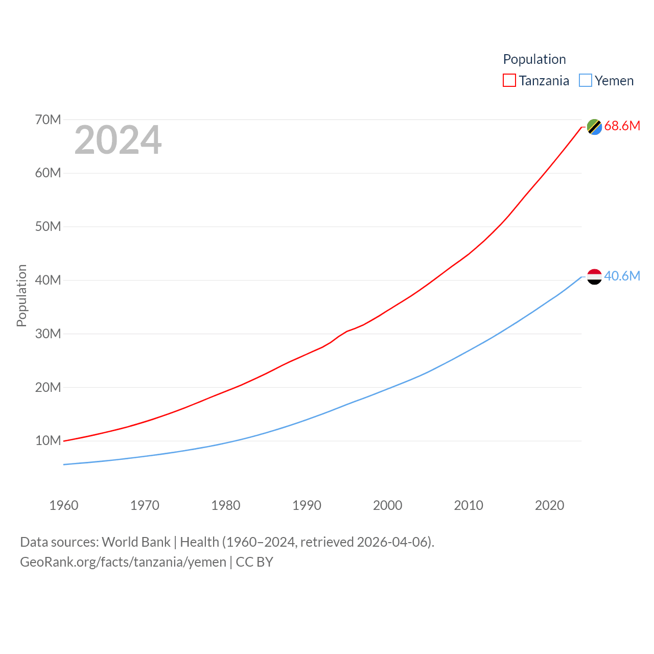 Tanzania has a population of 68.6M (ranked 22/197), compared with 40.6M in Yemen (ranked 38/197). Tanzania's land area is 342,009 sq mi versus 203,850 sq mi for Yemen (ranked 31st vs. 49th).
