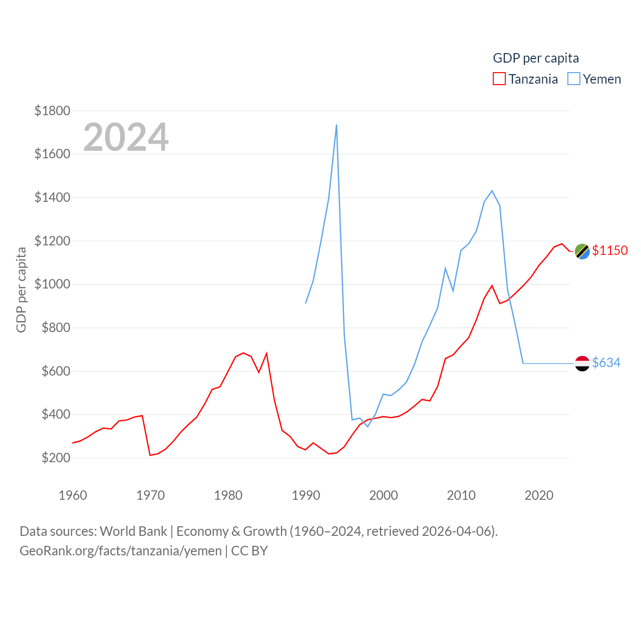 By GDP, Tanzania ranks 82/197 ($78.8B) and Yemen ranks 125/197 ($21.6B). By GDP per capita, Tanzania ranks 170/197 ($1,150), while Yemen ranks 191/197 ($634).