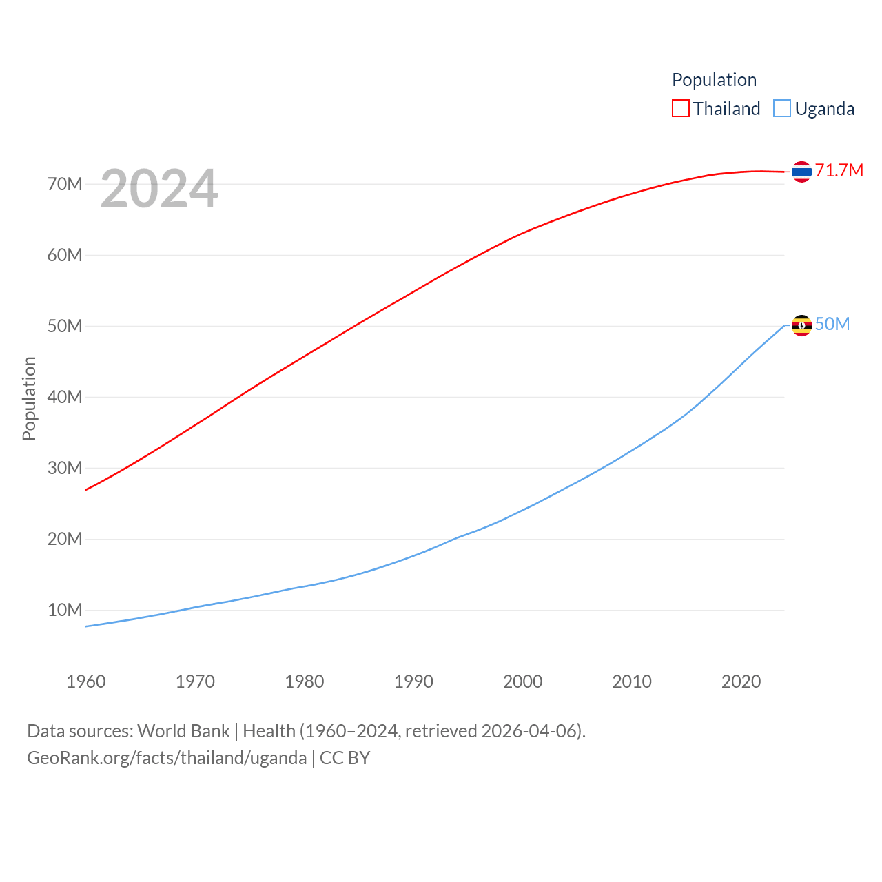 Thailand has a population of 71.7M (ranked 20/197), compared with 50M in Uganda (ranked 31/197). Thailand's land area is 197,256 sq mi versus 77,421 sq mi for Uganda (ranked 50th vs. 84th).