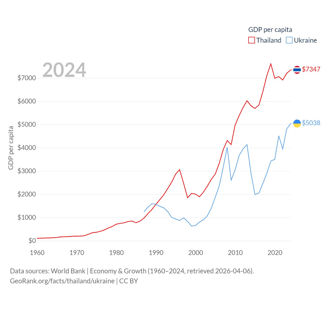 By GDP, Thailand ranks 31/197 ($527B) and Ukraine ranks 57/197 ($191B). By GDP per capita, Thailand ranks 100/197 ($7,347), while Ukraine ranks 120/197 ($5,038).