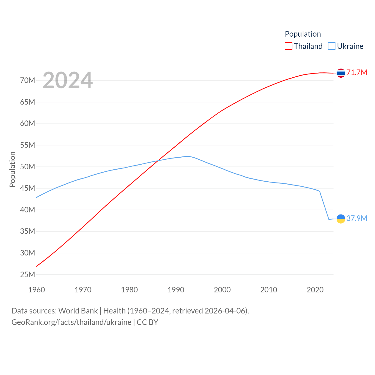 Thailand has a population of 71.7M (ranked 20/197), compared with 37.9M in Ukraine (ranked 41/197). Thailand's land area is 197,256 sq mi versus 223,708 sq mi for Ukraine (ranked 50th vs. 46th).
