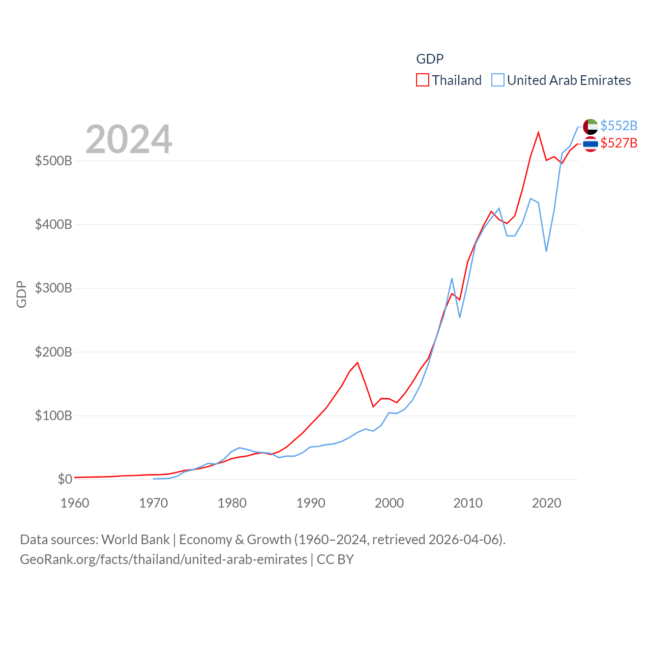 By GDP, Thailand ranks 31/197 ($527B) and The United Arab Emirates ranks 27/197 ($552B). By GDP per capita, Thailand ranks 100/197 ($7,347), while The United Arab Emirates ranks 24/197 ($50,274).