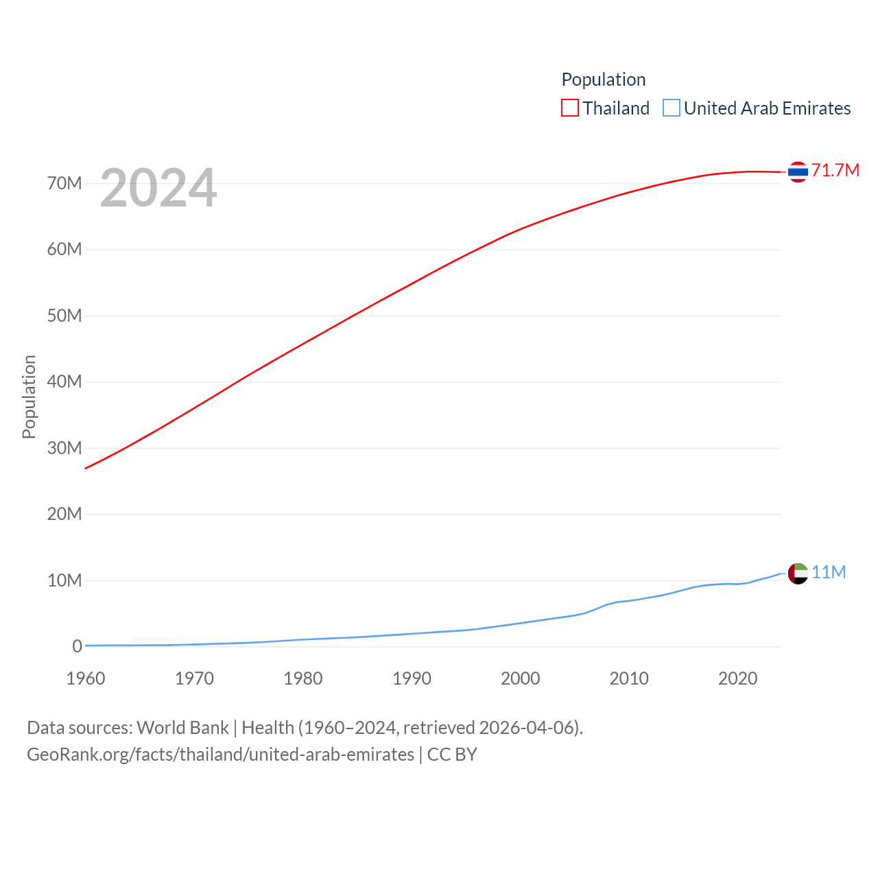 Thailand has a population of 71.7M (ranked 20/197), compared with 11M in The United Arab Emirates (ranked 86/197). Thailand's land area is 197,256 sq mi versus 27,421 sq mi for The United Arab Emirates (ranked 50th vs. 117th).
