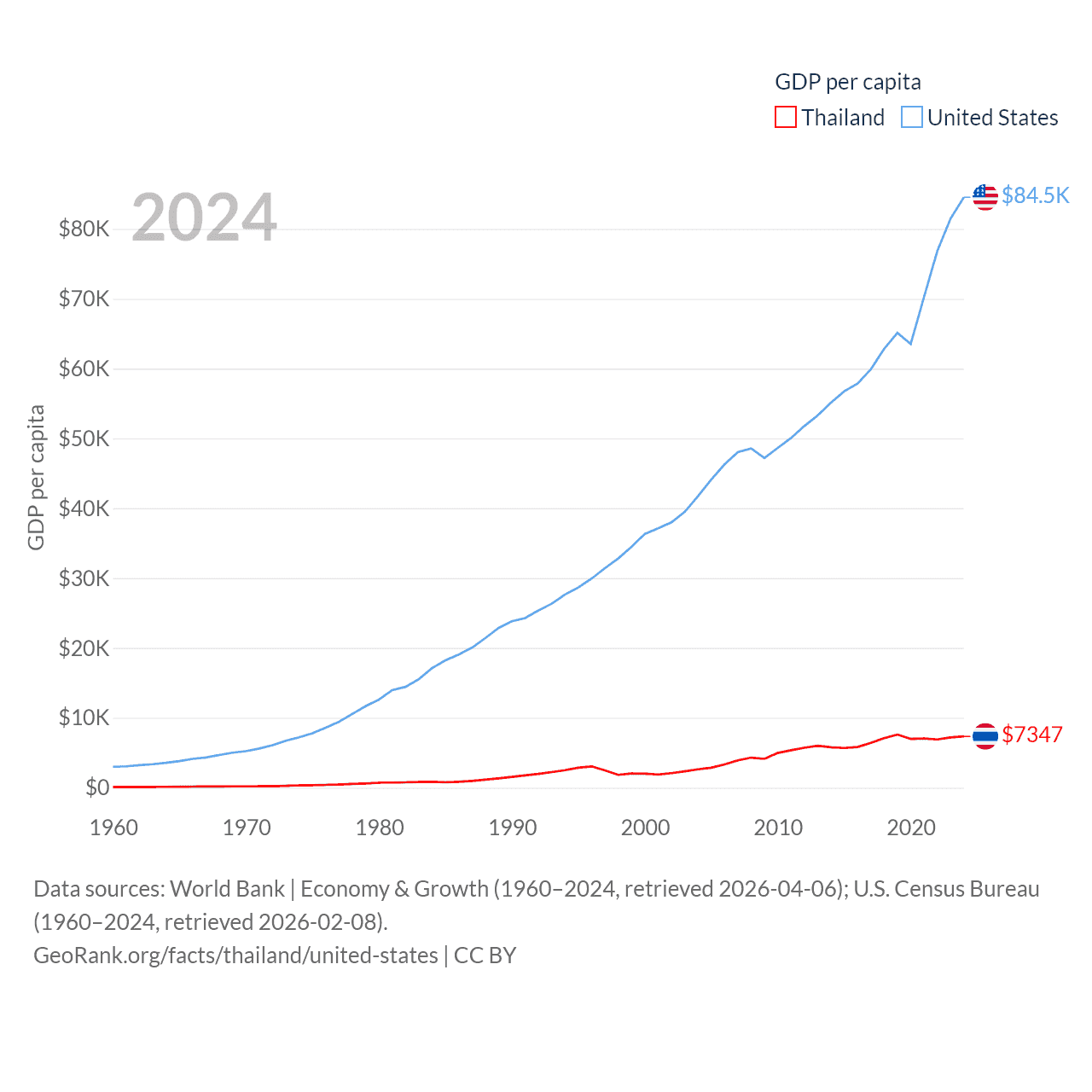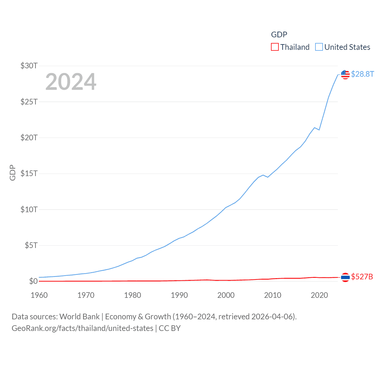 By GDP, Thailand ranks 31/197 ($527B) and The United States ranks 1/197 ($28.8T). By GDP per capita, Thailand ranks 100/197 ($7,347), while The United States ranks 10/197 ($84,534).