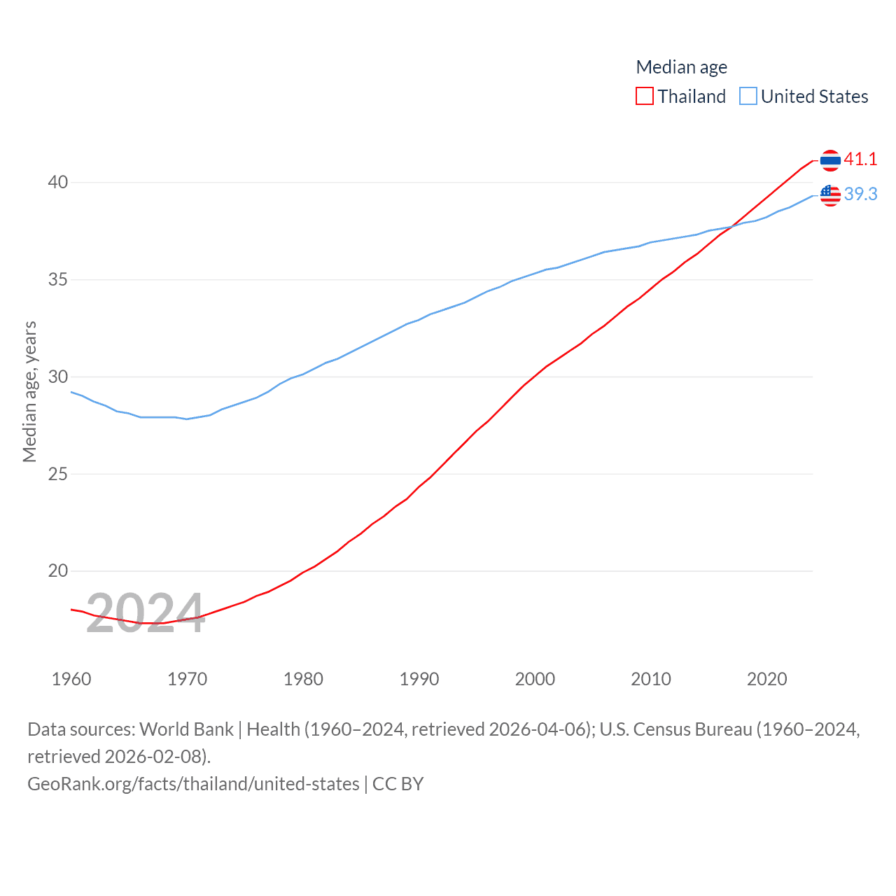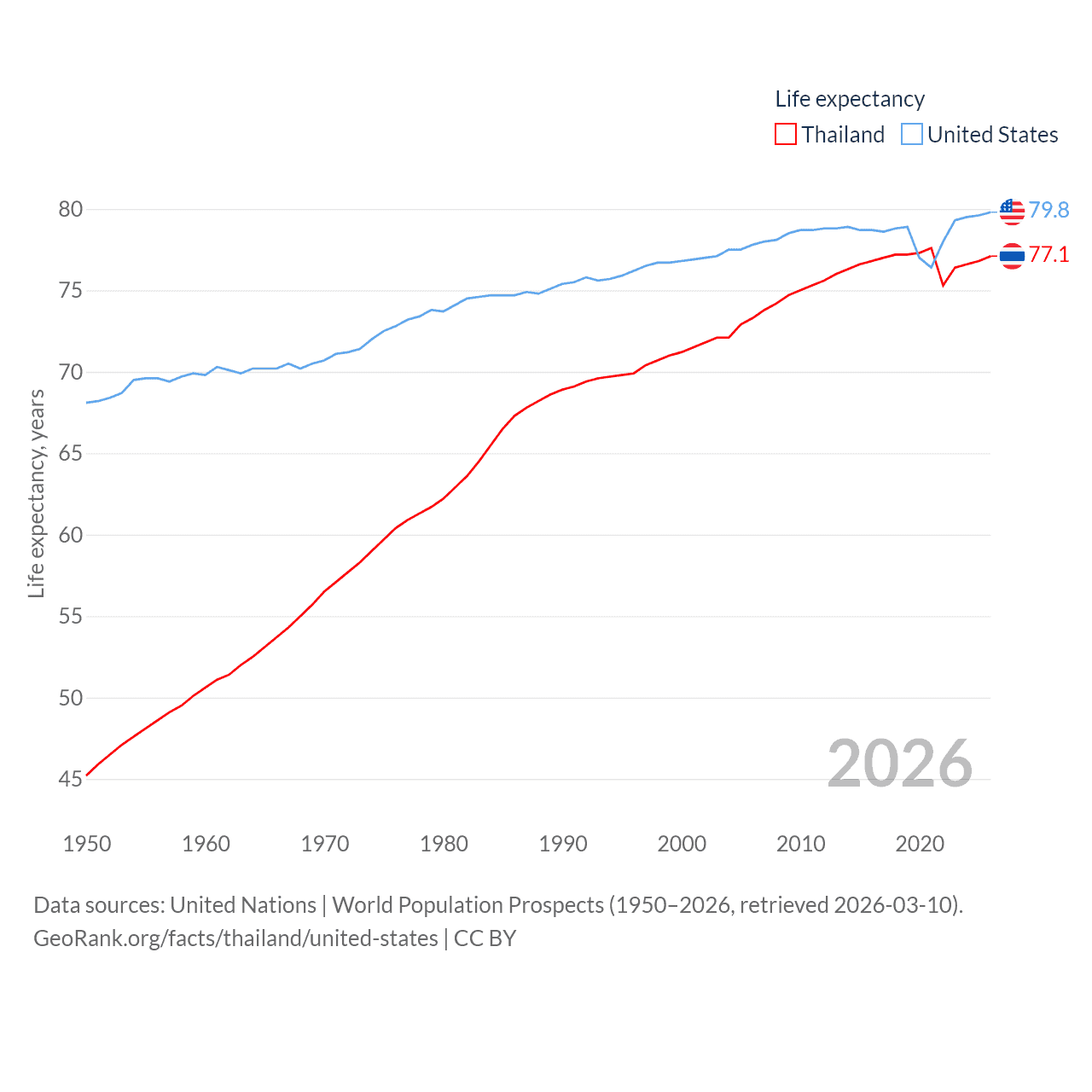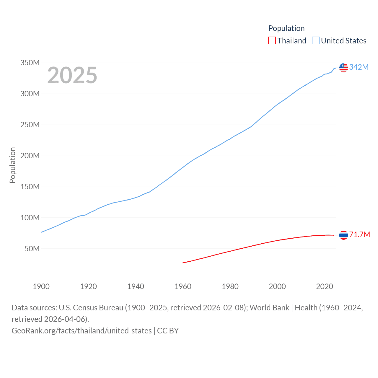 Thailand has a population of 71.7M (ranked 20/197), compared with 342M in The United States (ranked 3/197). Thailand's land area is 197,256 sq mi versus 3,531,839 sq mi for The United States (ranked 50th vs. 3rd).