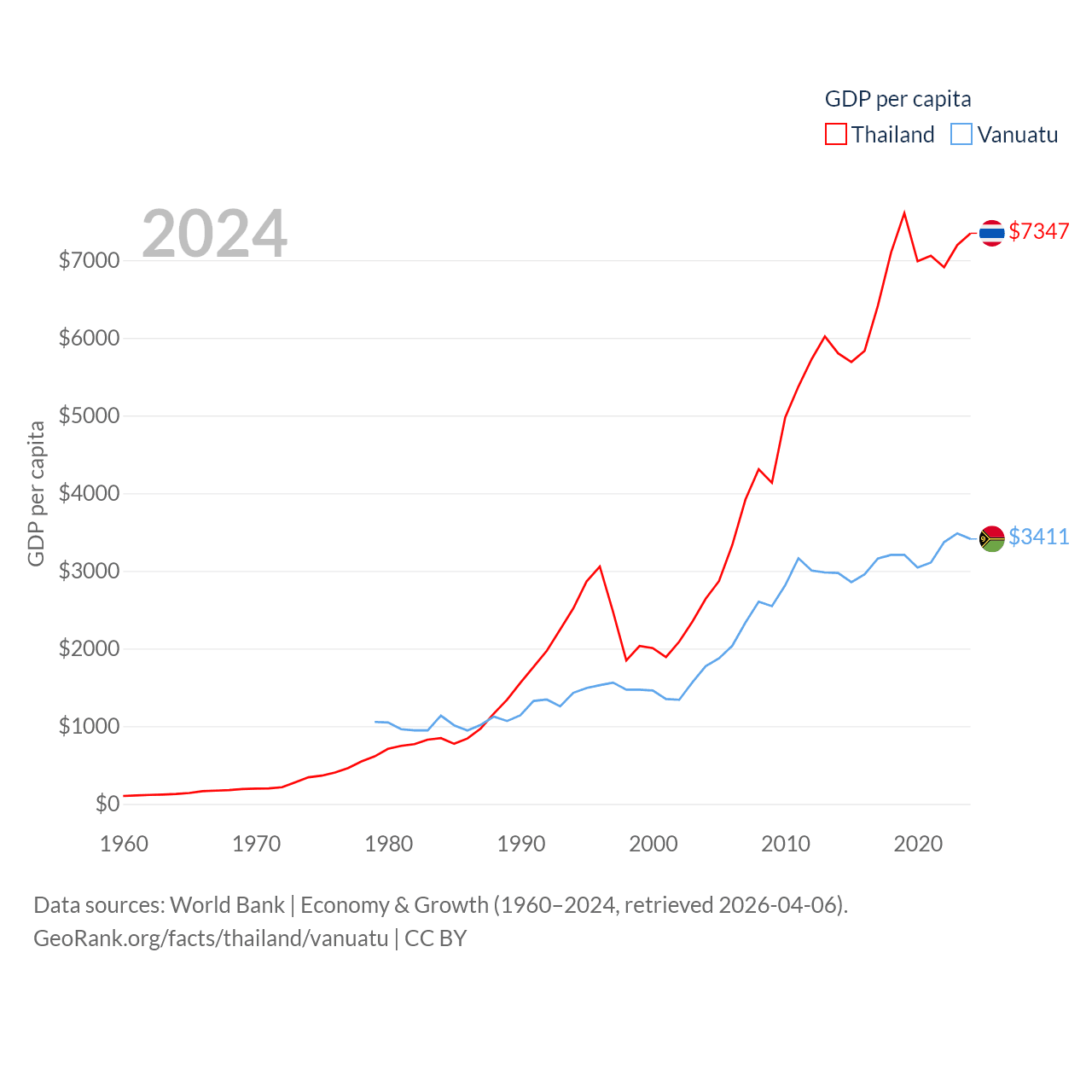 By GDP, Thailand ranks 31/197 ($527B) and Vanuatu ranks 188/197 ($1.12B). By GDP per capita, Thailand ranks 100/197 ($7,347), while Vanuatu ranks 137/197 ($3,411).