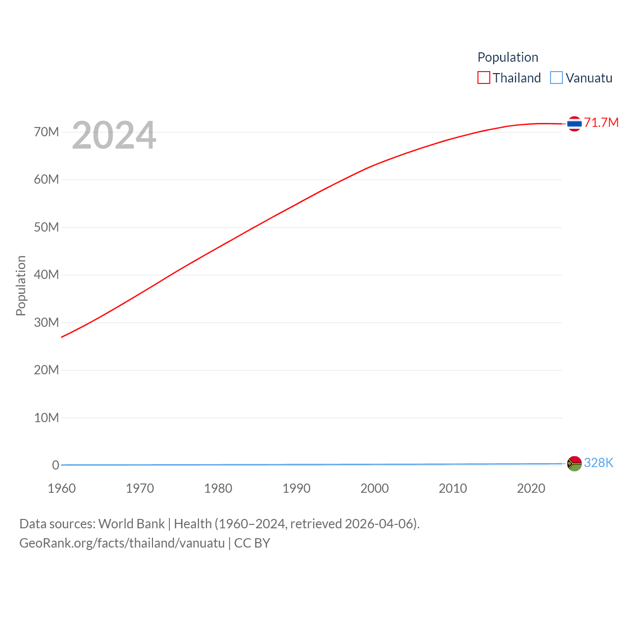 Thailand has a population of 71.7M (ranked 20/197), compared with 328K in Vanuatu (ranked 174/197). Thailand's land area is 197,256 sq mi versus 4,707 sq mi for Vanuatu (ranked 50th vs. 157th).