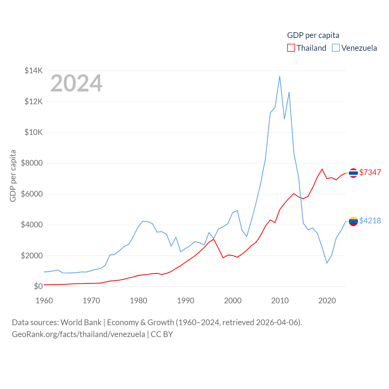 By GDP, Thailand ranks 31/197 ($527B) and Venezuela ranks 65/197 ($120B). By GDP per capita, Thailand ranks 100/197 ($7,347), while Venezuela ranks 128/197 ($4,218).