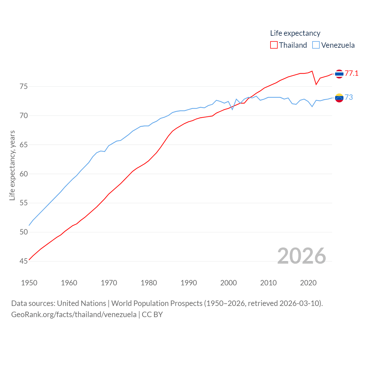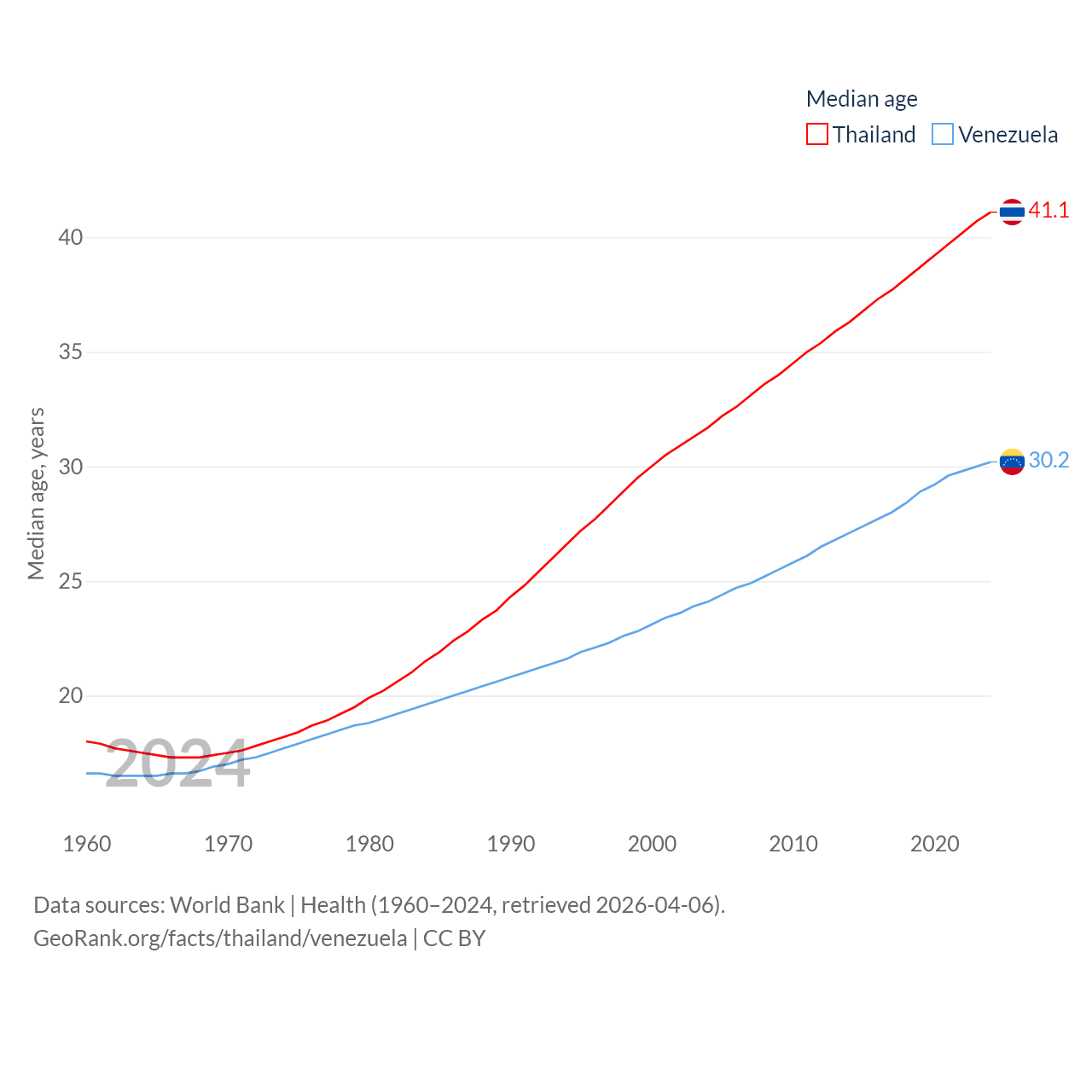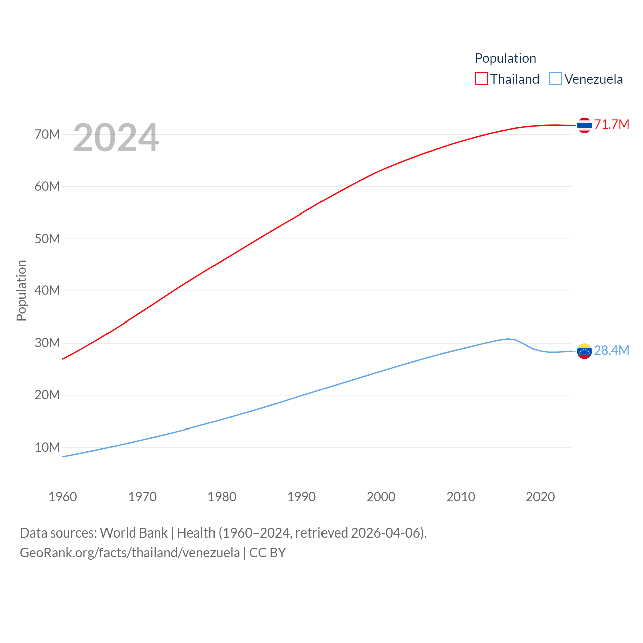 Thailand has a population of 71.7M (ranked 20/197), compared with 28.4M in Venezuela (ranked 53/197). Thailand's land area is 197,256 sq mi versus 340,561 sq mi for Venezuela (ranked 50th vs. 32nd).