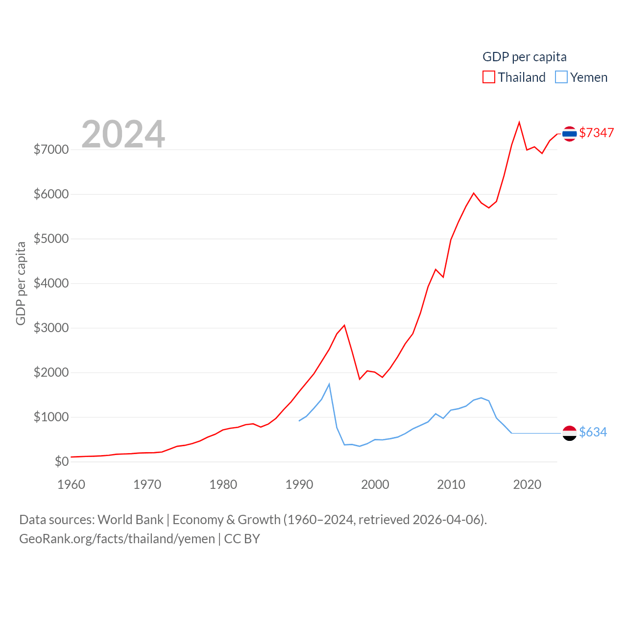 By GDP, Thailand ranks 31/197 ($527B) and Yemen ranks 125/197 ($21.6B). By GDP per capita, Thailand ranks 100/197 ($7,347), while Yemen ranks 191/197 ($634).