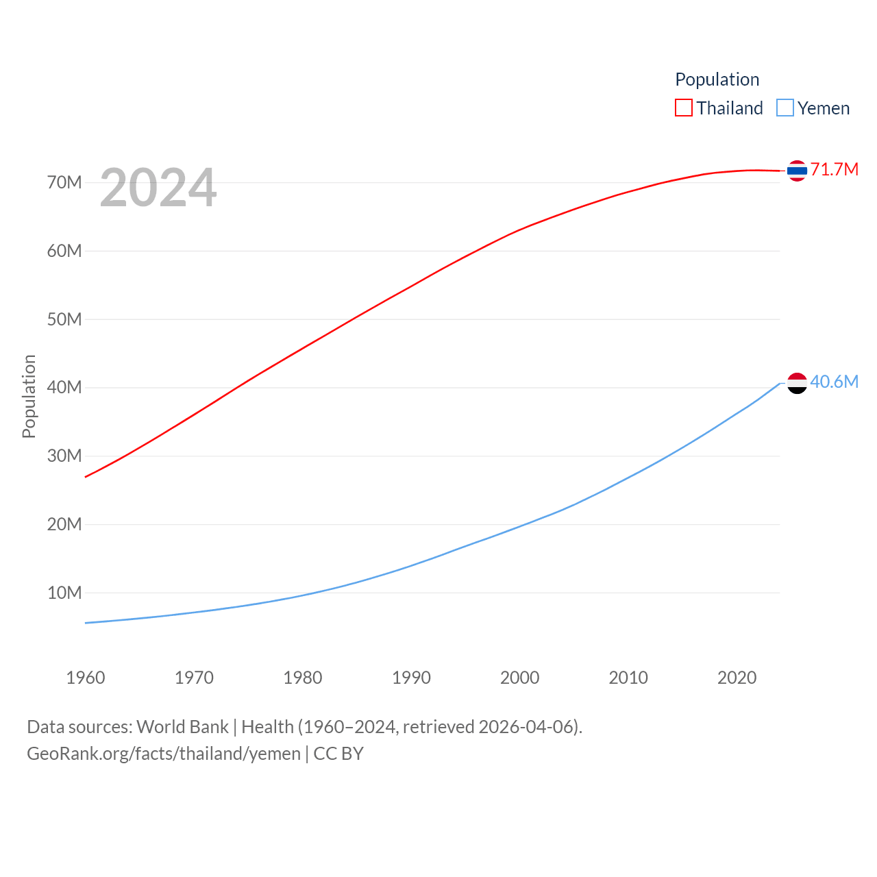 Thailand has a population of 71.7M (ranked 20/197), compared with 40.6M in Yemen (ranked 38/197). Thailand's land area is 197,256 sq mi versus 203,850 sq mi for Yemen (ranked 50th vs. 49th).