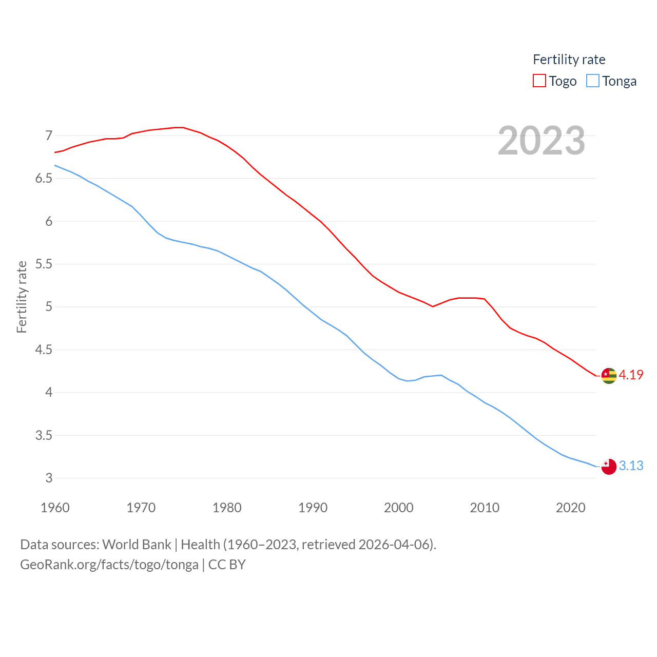 Togo has a population of 9.52M (ranked 98/197), compared with 104K in Tonga (ranked 183/197). Togo's land area is 21,000 sq mi versus 278 sq mi for Tonga (ranked 124th vs. 176th).