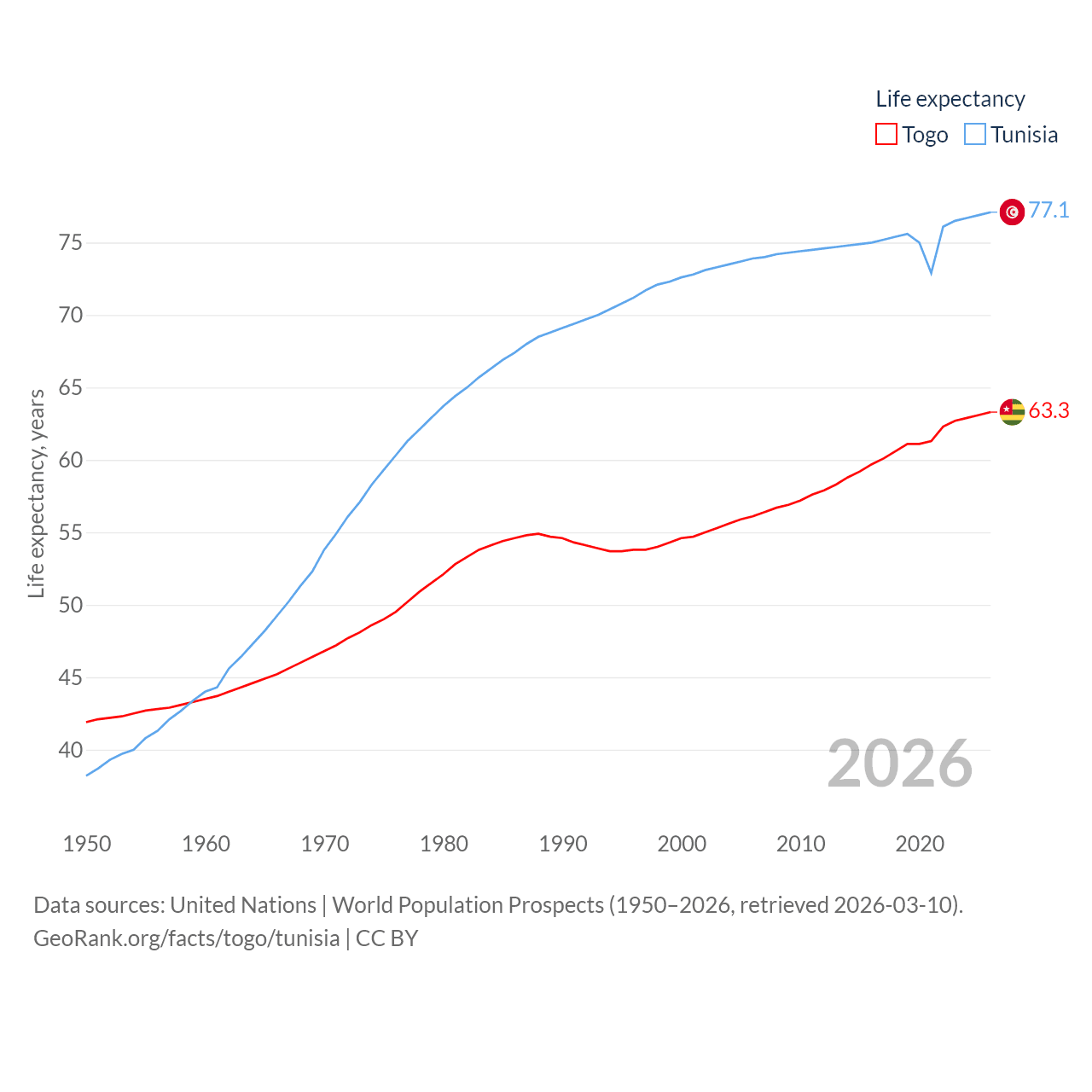 Togo has a population of 9.52M (ranked 98/197), compared with 12.3M in Tunisia (ranked 80/197). Togo's land area is 21,000 sq mi versus 59,985 sq mi for Tunisia (ranked 124th vs. 91st).