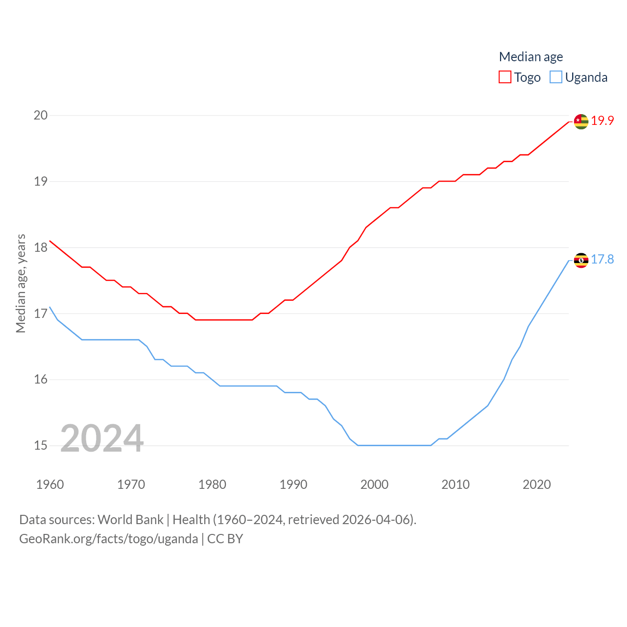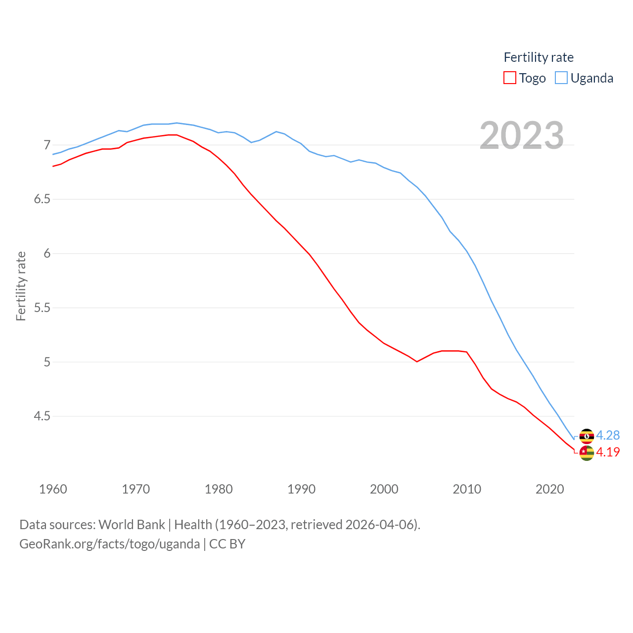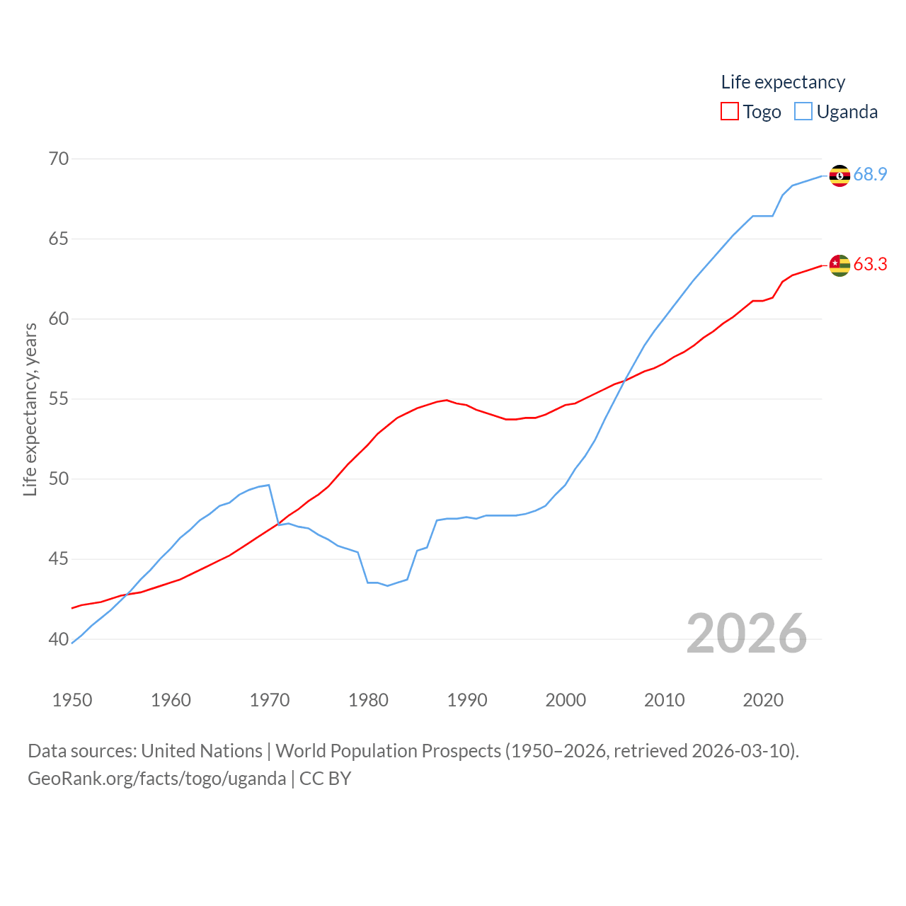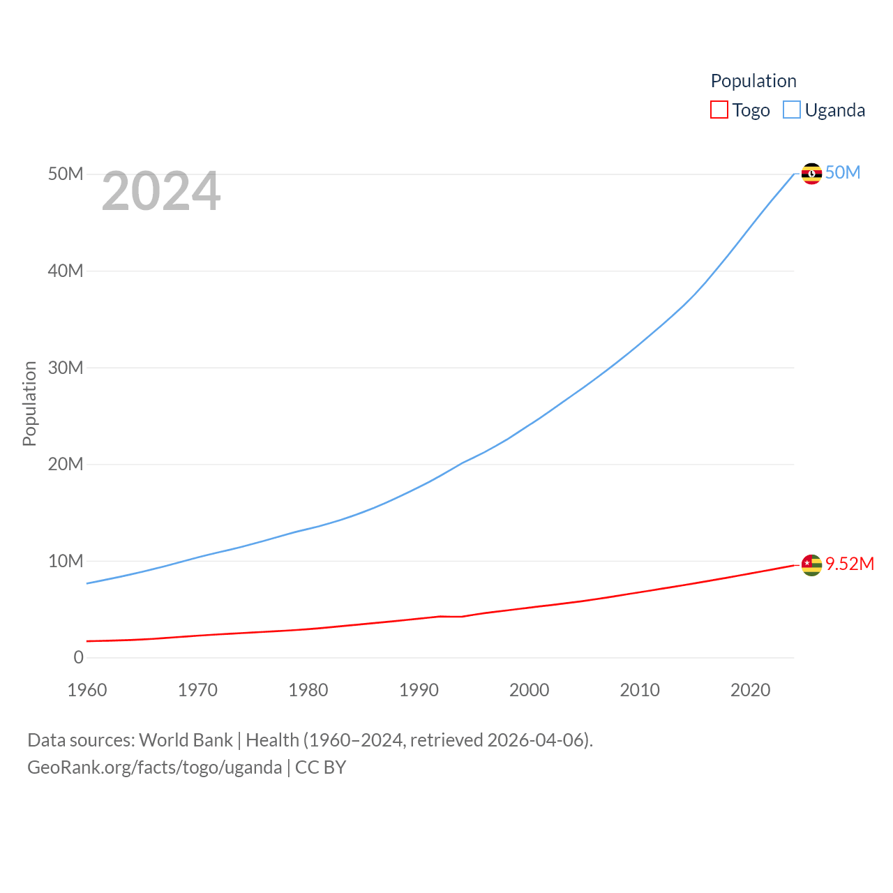 Togo has a population of 9.52M (ranked 98/197), compared with 50M in Uganda (ranked 31/197). Togo's land area is 21,000 sq mi versus 77,421 sq mi for Uganda (ranked 124th vs. 84th).