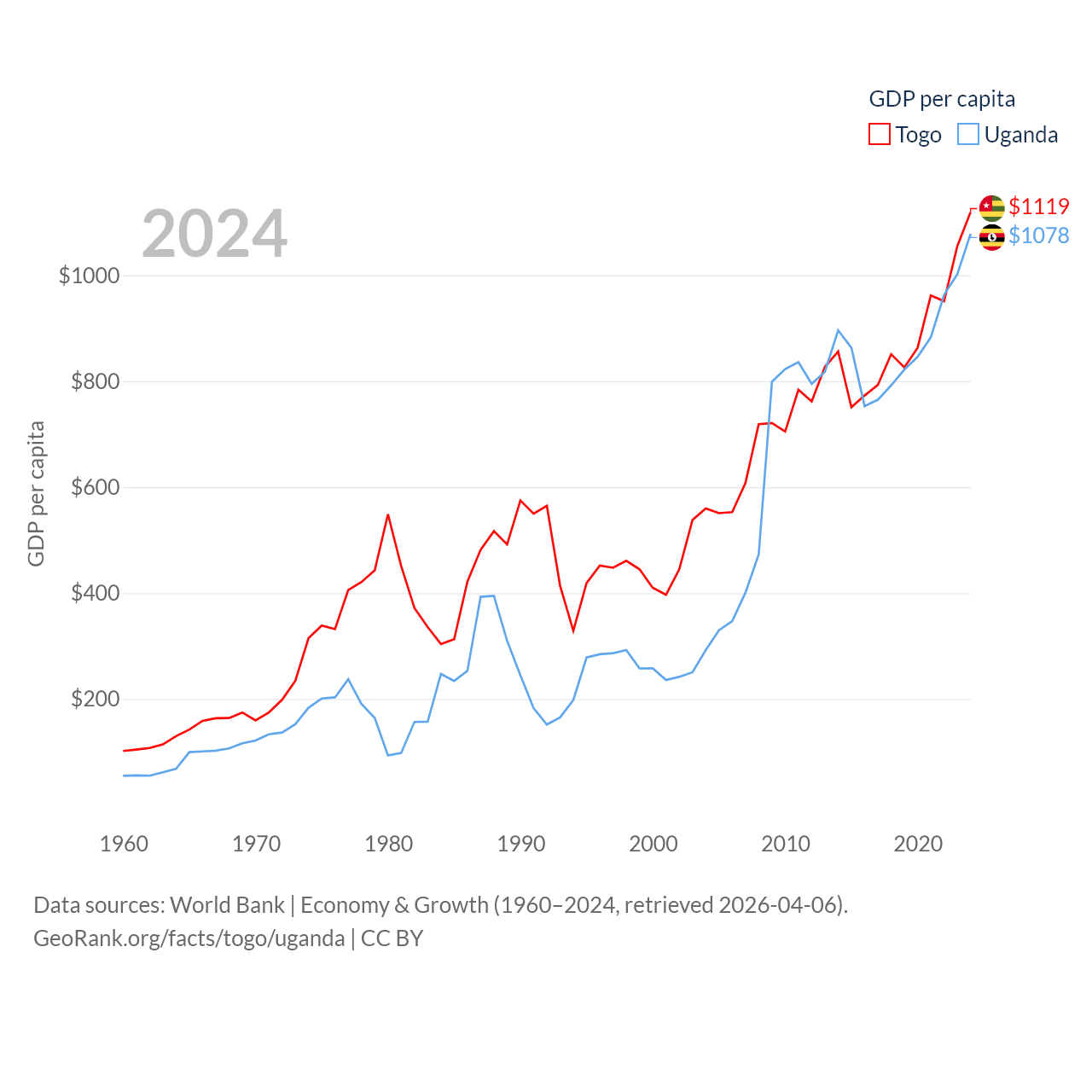 By GDP, Togo ranks 154/197 ($10.7B) and Uganda ranks 89/197 ($53.9B). By GDP per capita, Togo ranks 172/197 ($1,119), while Uganda ranks 176/197 ($1,078).