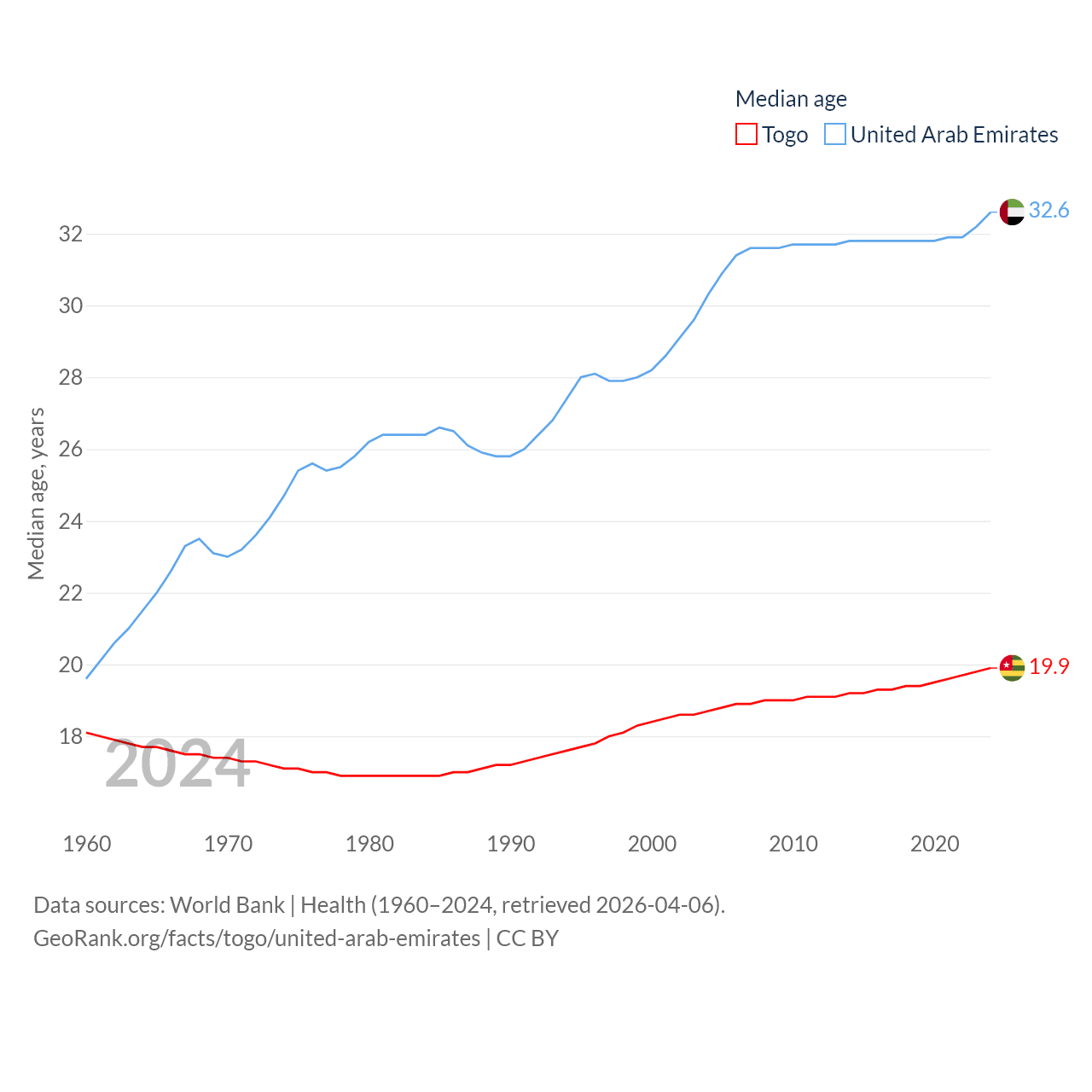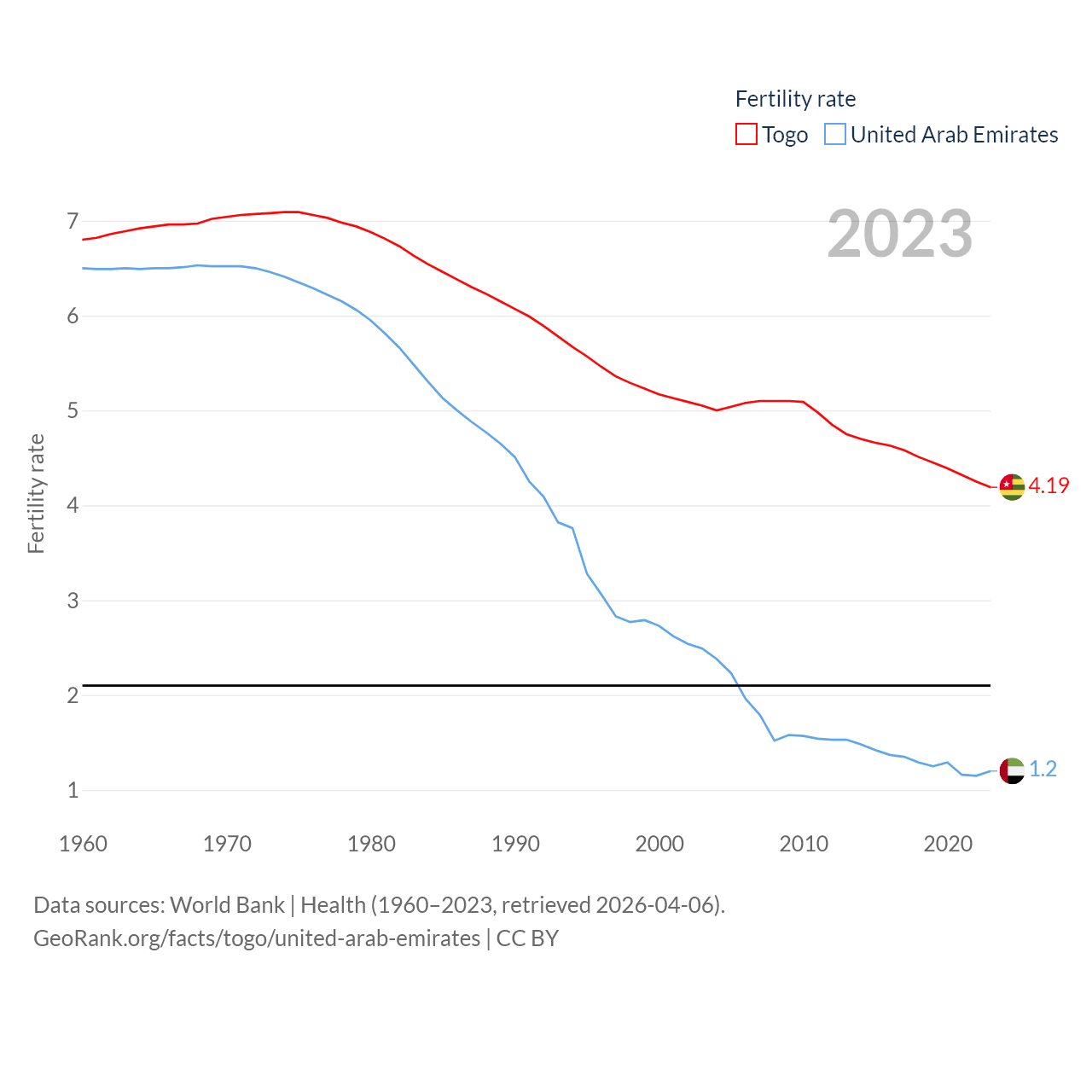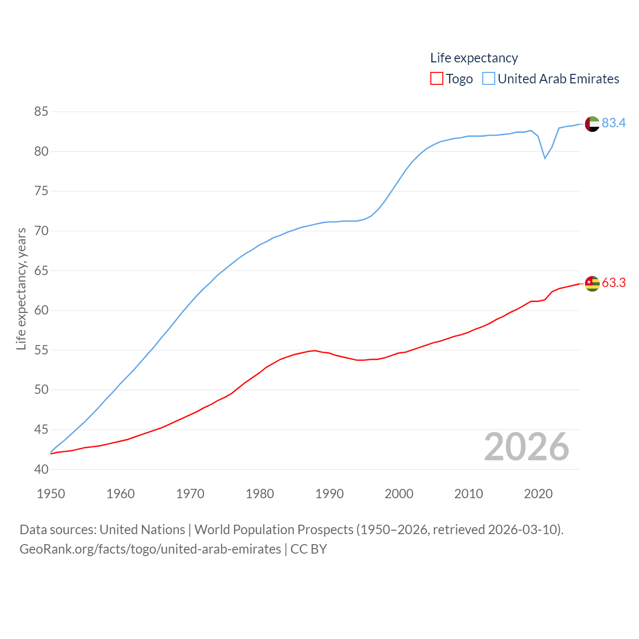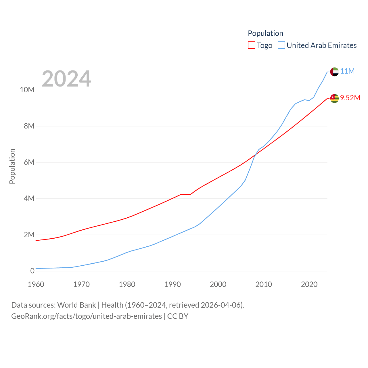 Togo has a population of 9.52M (ranked 98/197), compared with 11M in The United Arab Emirates (ranked 86/197). Togo's land area is 21,000 sq mi versus 27,421 sq mi for The United Arab Emirates (ranked 124th vs. 117th).