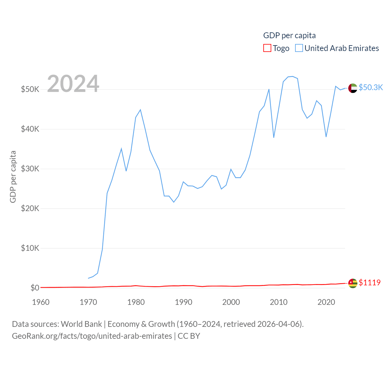 By GDP, Togo ranks 154/197 ($10.7B) and The United Arab Emirates ranks 27/197 ($552B). By GDP per capita, Togo ranks 172/197 ($1,119), while The United Arab Emirates ranks 24/197 ($50,274).