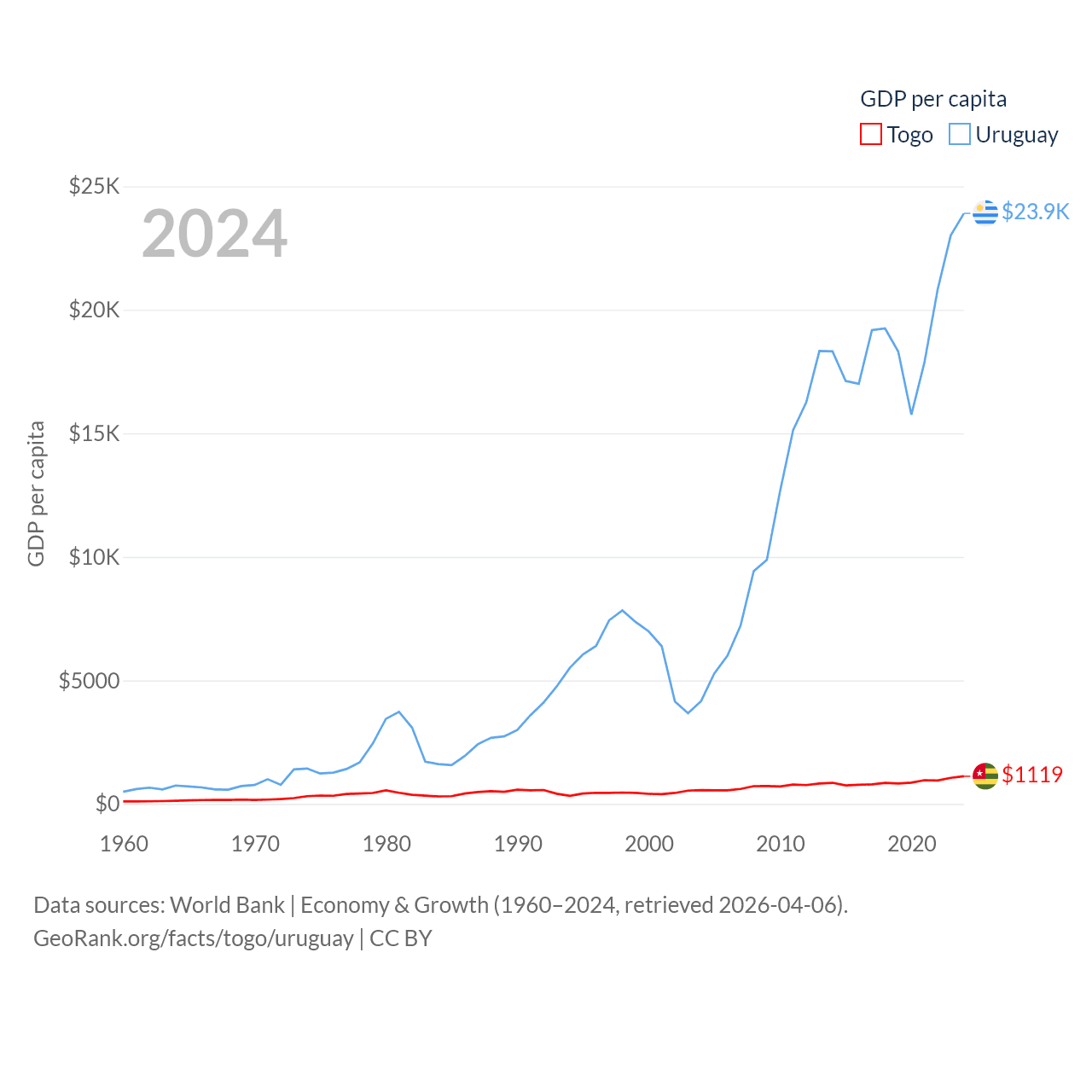 By GDP, Togo ranks 154/197 ($10.7B) and Uruguay ranks 81/197 ($81B). By GDP per capita, Togo ranks 172/197 ($1,119), while Uruguay ranks 52/197 ($23,907).