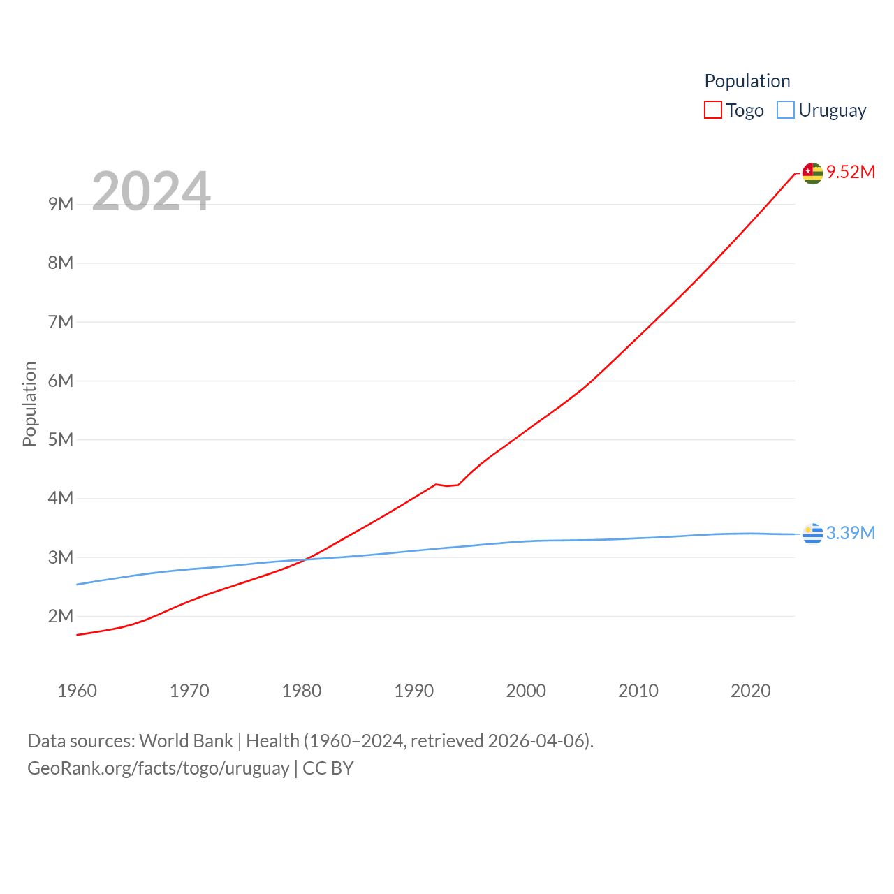 Togo has a population of 9.52M (ranked 98/197), compared with 3.39M in Uruguay (ranked 133/197). Togo's land area is 21,000 sq mi versus 67,576 sq mi for Uruguay (ranked 124th vs. 89th).