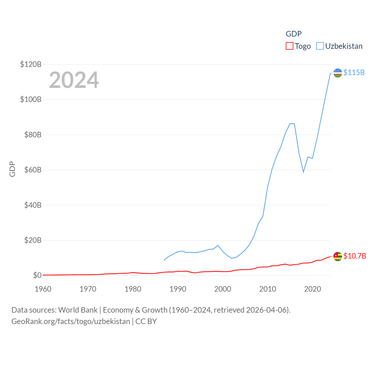 By GDP, Togo ranks 154/197 ($10.7B) and Uzbekistan ranks 66/197 ($115B). By GDP per capita, Togo ranks 172/197 ($1,119), while Uzbekistan ranks 139/197 ($3,162).