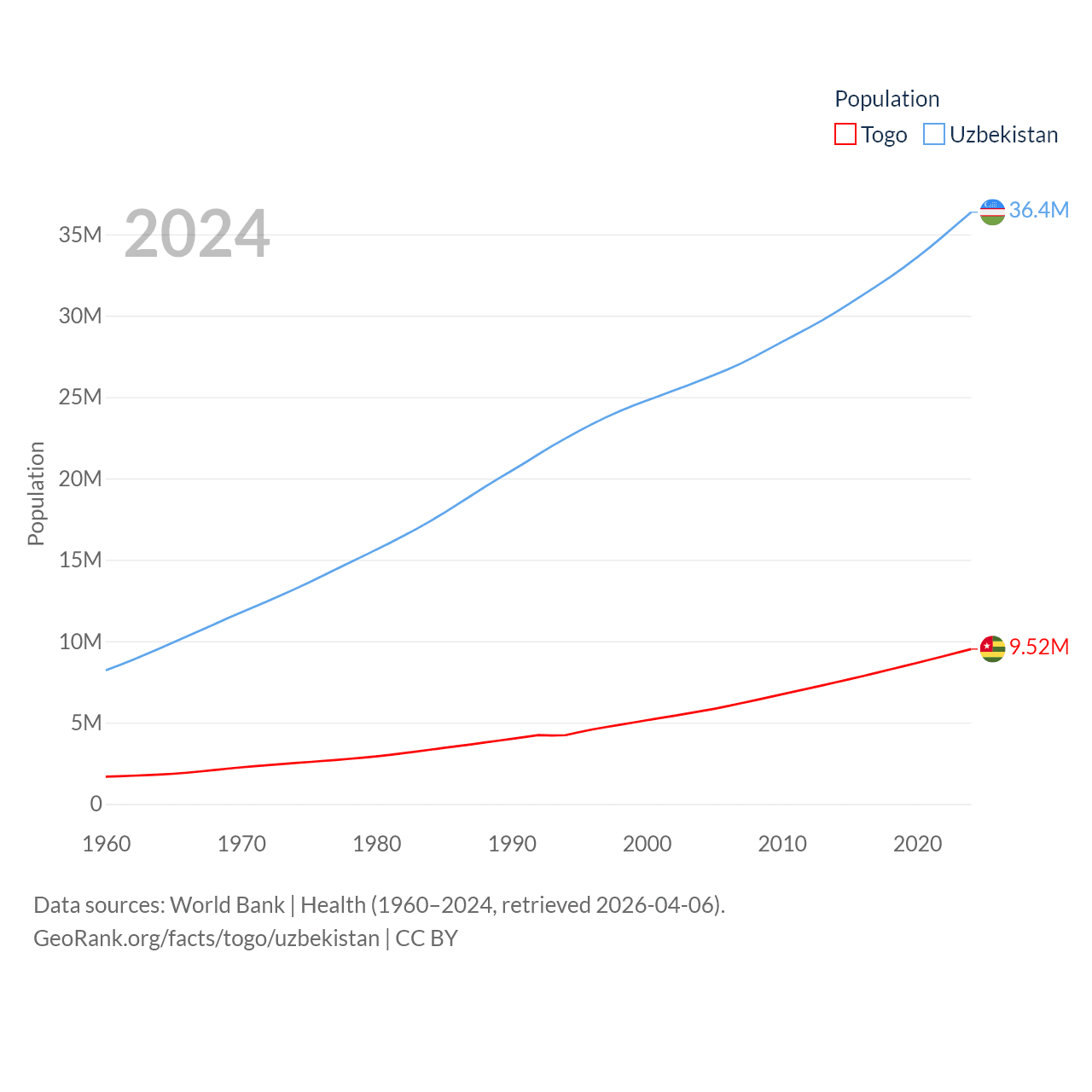 Togo has a population of 9.52M (ranked 98/197), compared with 36.4M in Uzbekistan (ranked 43/197). Togo's land area is 21,000 sq mi versus 170,136 sq mi for Uzbekistan (ranked 124th vs. 56th).