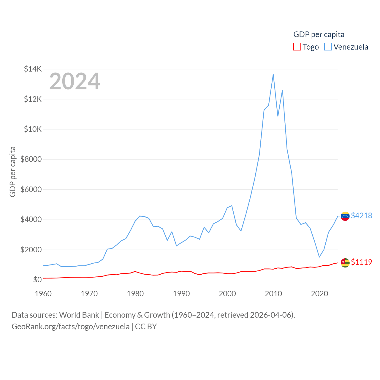 By GDP, Togo ranks 154/197 ($10.7B) and Venezuela ranks 65/197 ($120B). By GDP per capita, Togo ranks 172/197 ($1,119), while Venezuela ranks 128/197 ($4,218).