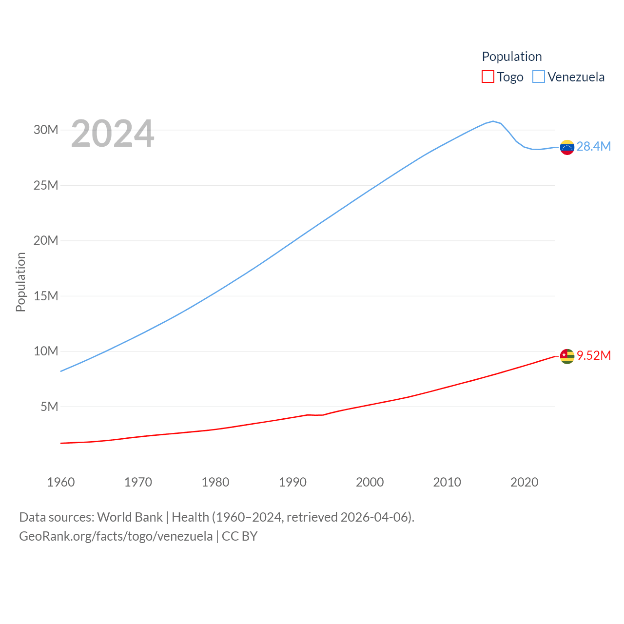 Togo has a population of 9.52M (ranked 98/197), compared with 28.4M in Venezuela (ranked 53/197). Togo's land area is 21,000 sq mi versus 340,561 sq mi for Venezuela (ranked 124th vs. 32nd).