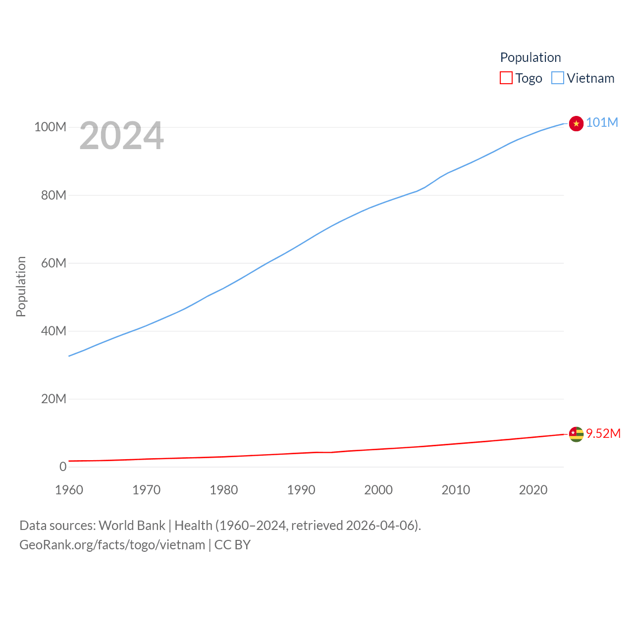 Togo has a population of 9.52M (ranked 98/197), compared with 101M in Vietnam (ranked 16/197). Togo's land area is 21,000 sq mi versus 121,016 sq mi for Vietnam (ranked 124th vs. 67th).