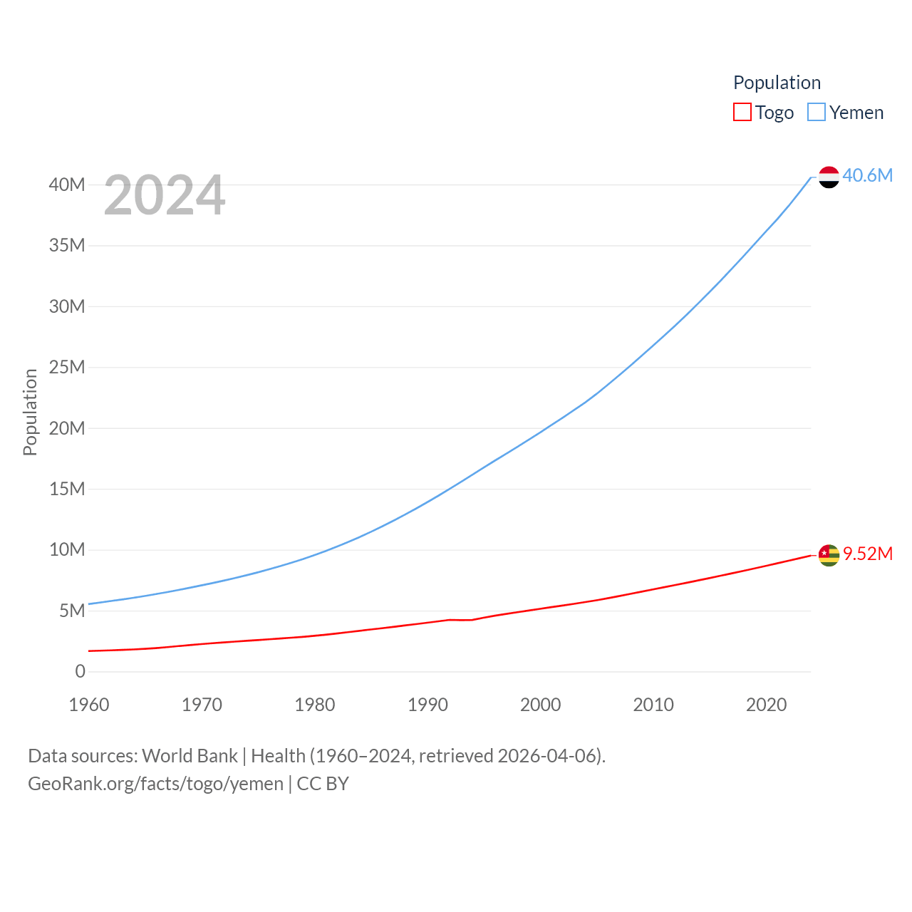 Togo has a population of 9.52M (ranked 98/197), compared with 40.6M in Yemen (ranked 38/197). Togo's land area is 21,000 sq mi versus 203,850 sq mi for Yemen (ranked 124th vs. 49th).