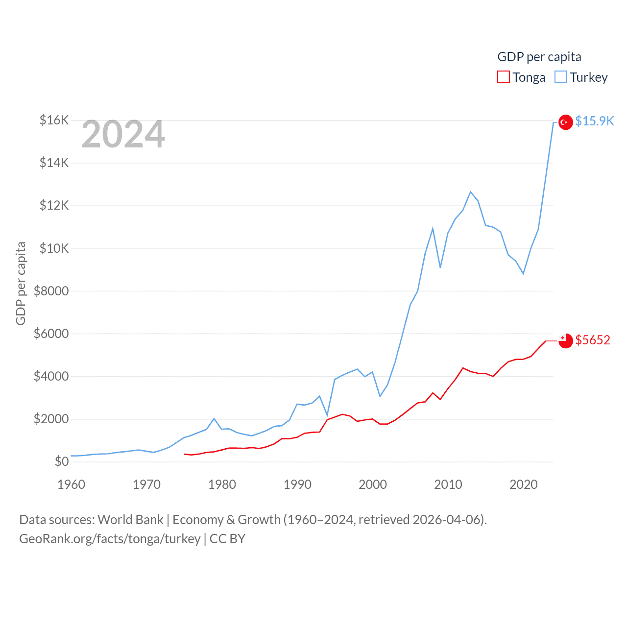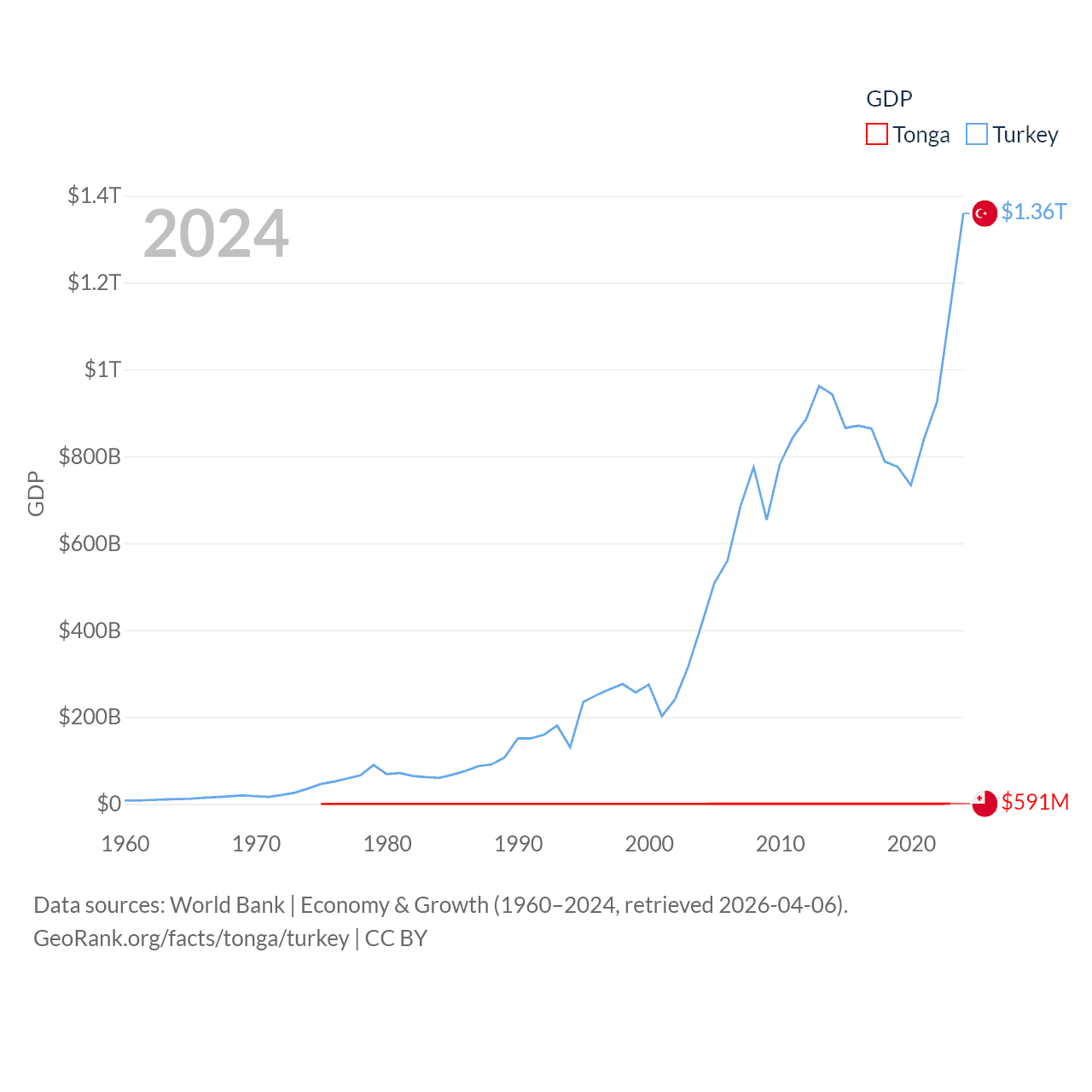 By GDP, Tonga ranks 191/197 ($591M) and Turkey ranks 17/197 ($1.36T). By GDP per capita, Tonga ranks 115/197 ($5,652), while Turkey ranks 66/197 ($15,893).