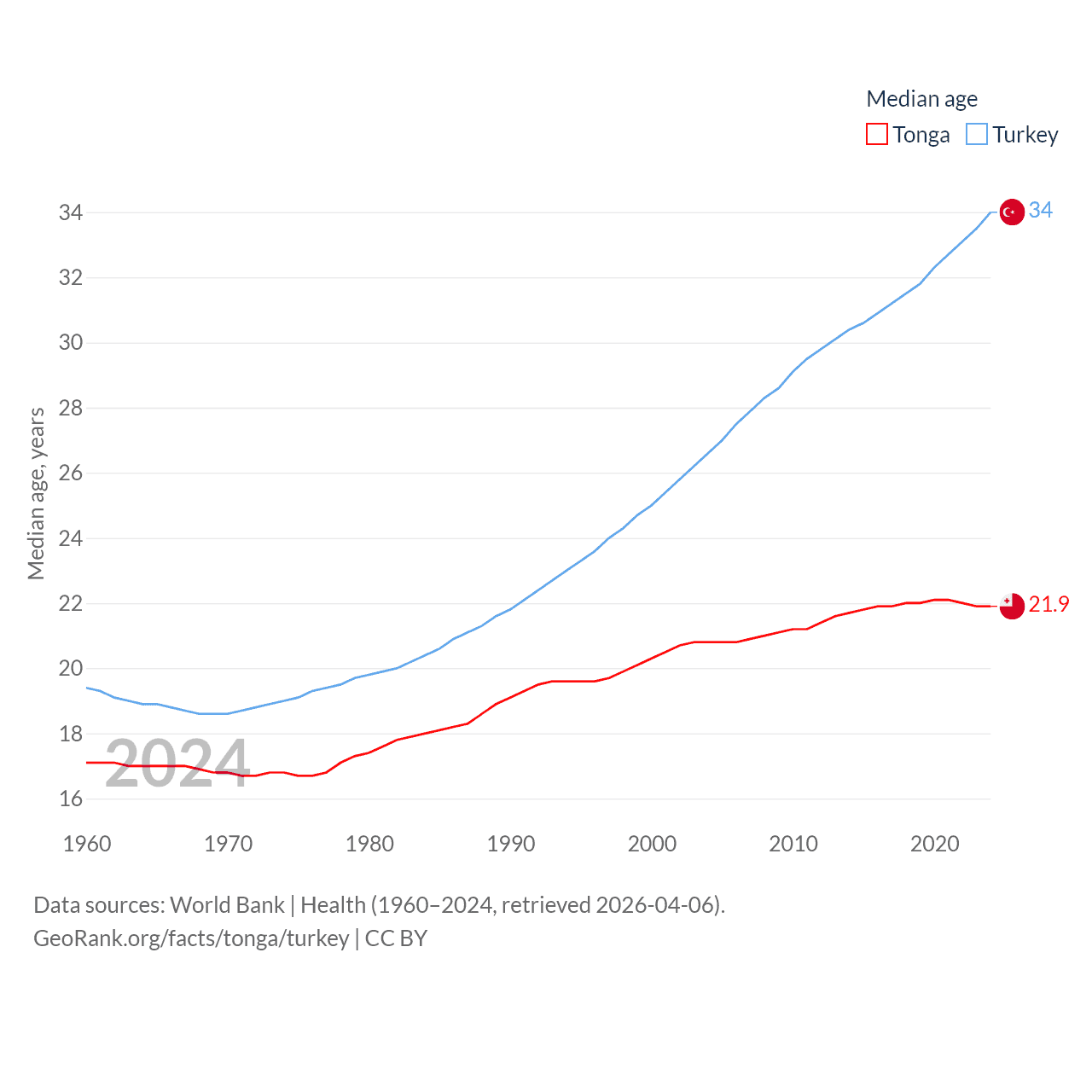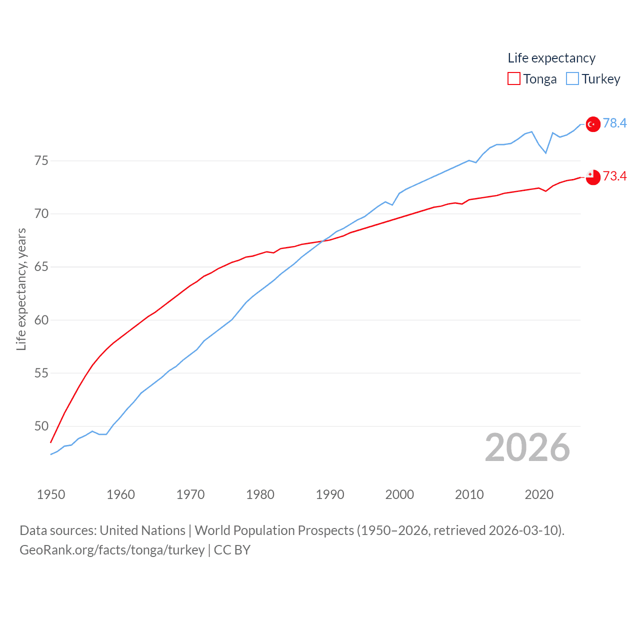 Tonga has a population of 104K (ranked 183/197), compared with 85.5M in Turkey (ranked 18/197). Tonga's land area is 278 sq mi versus 297,156 sq mi for Turkey (ranked 176th vs. 36th).