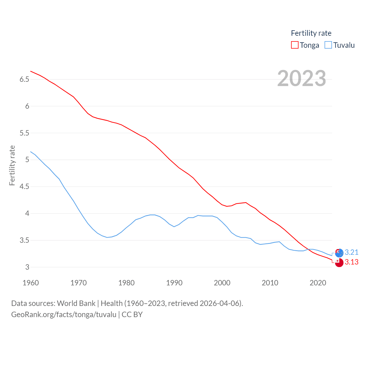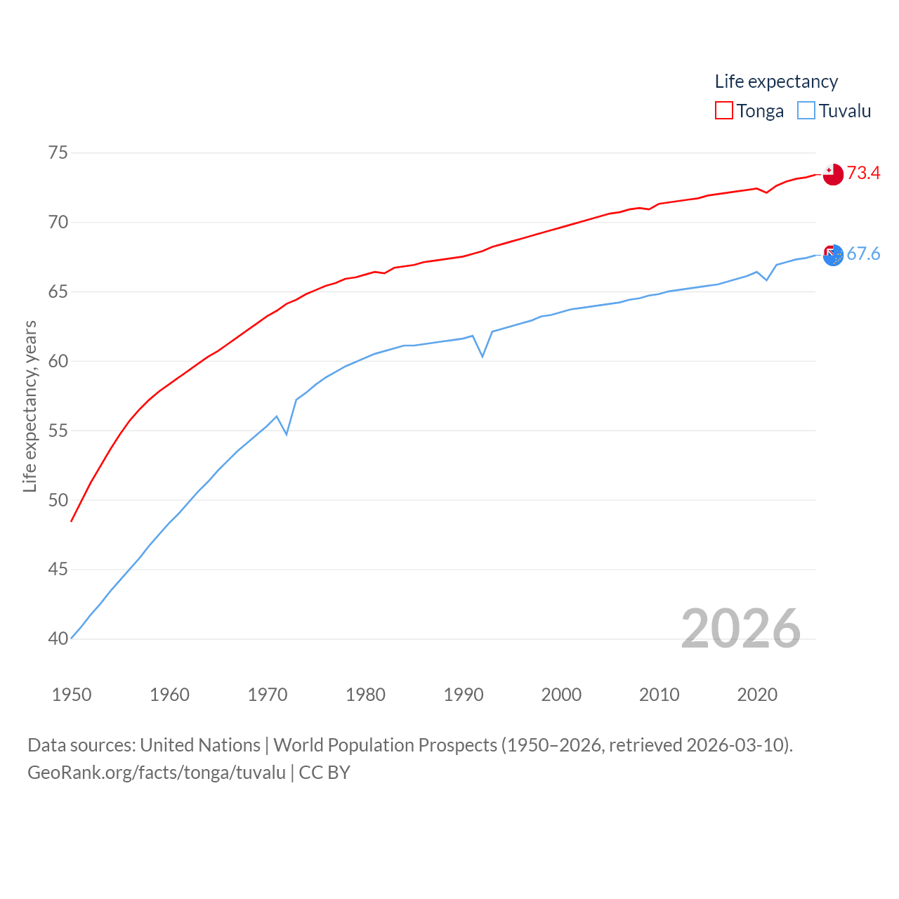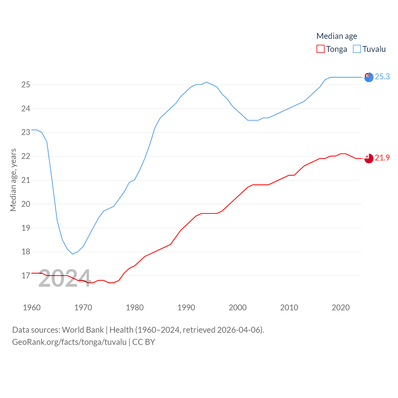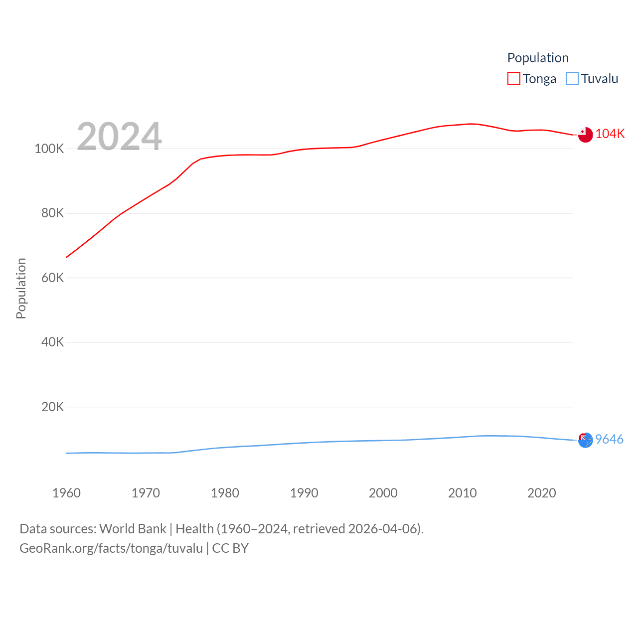 Tonga has a population of 104K (ranked 183/197), compared with 9.65K in Tuvalu (ranked 196/197). Tonga's land area is 278 sq mi versus 11.6 sq mi for Tuvalu (ranked 176th vs. 194th).