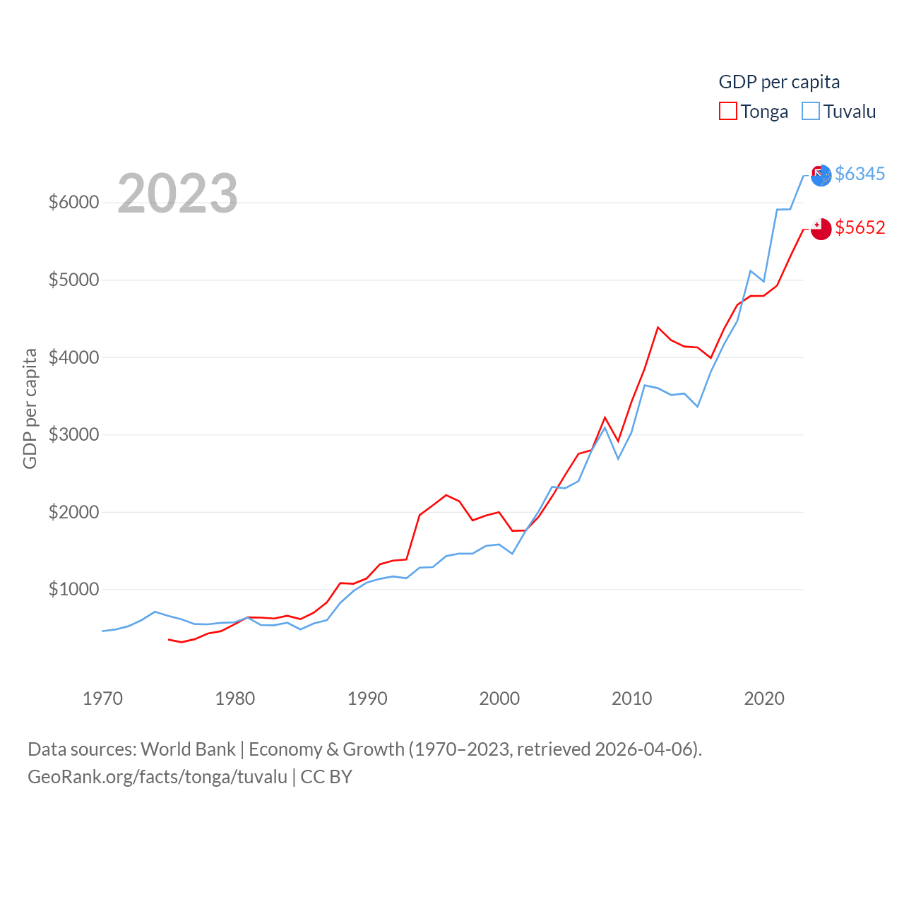 By GDP, Tonga ranks 191/197 ($591M) and Tuvalu ranks 196/197 ($62.3M). By GDP per capita, Tonga ranks 115/197 ($5,652), while Tuvalu ranks 110/197 ($6,345).