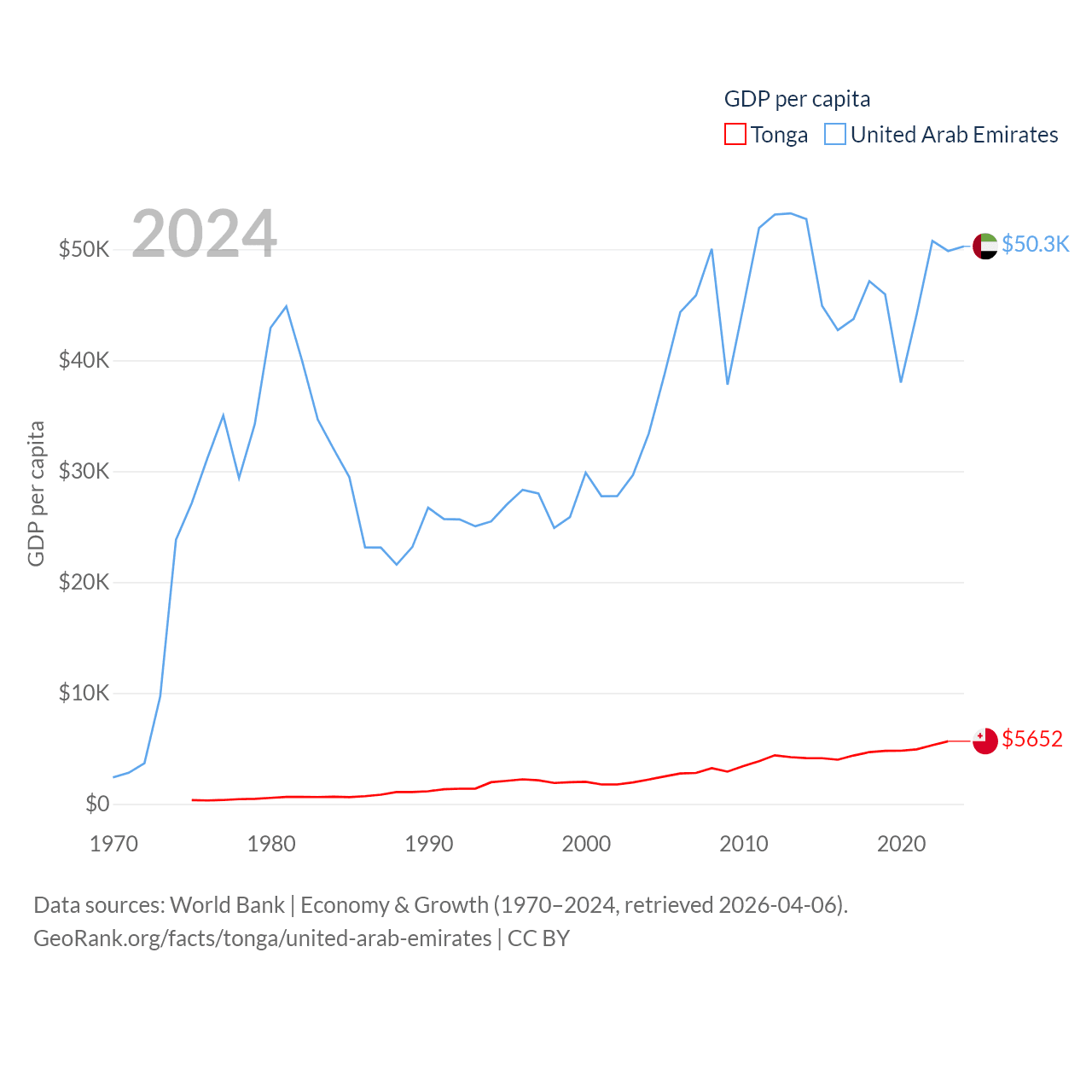 By GDP, Tonga ranks 191/197 ($591M) and The United Arab Emirates ranks 27/197 ($552B). By GDP per capita, Tonga ranks 115/197 ($5,652), while The United Arab Emirates ranks 24/197 ($50,274).
