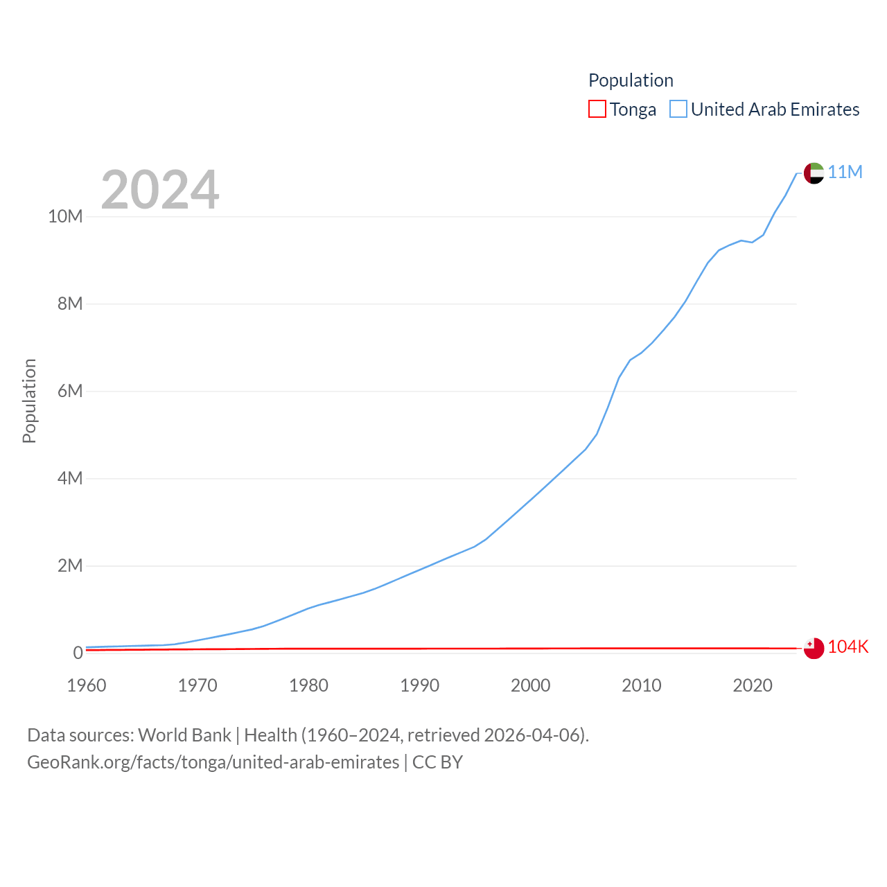 Tonga has a population of 104K (ranked 183/197), compared with 11M in The United Arab Emirates (ranked 86/197). Tonga's land area is 278 sq mi versus 27,421 sq mi for The United Arab Emirates (ranked 176th vs. 117th).
