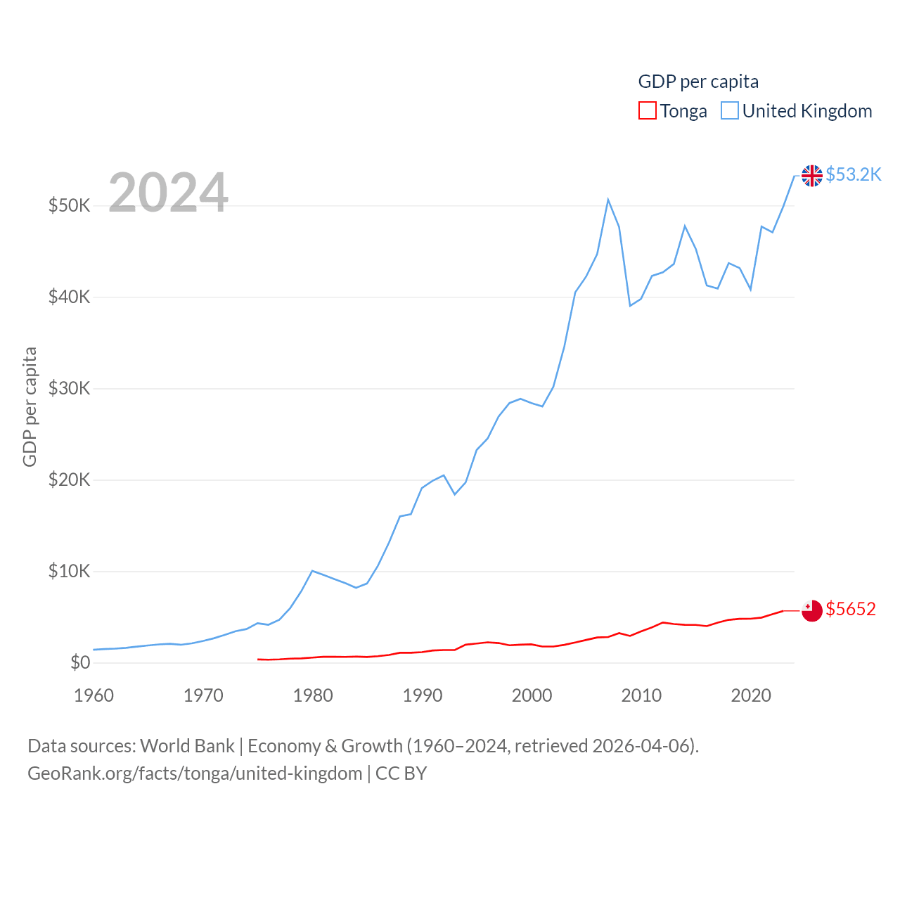 By GDP, Tonga ranks 191/197 ($591M) and The United Kingdom ranks 6/197 ($3.69T). By GDP per capita, Tonga ranks 115/197 ($5,652), while The United Kingdom ranks 22/197 ($53,246).