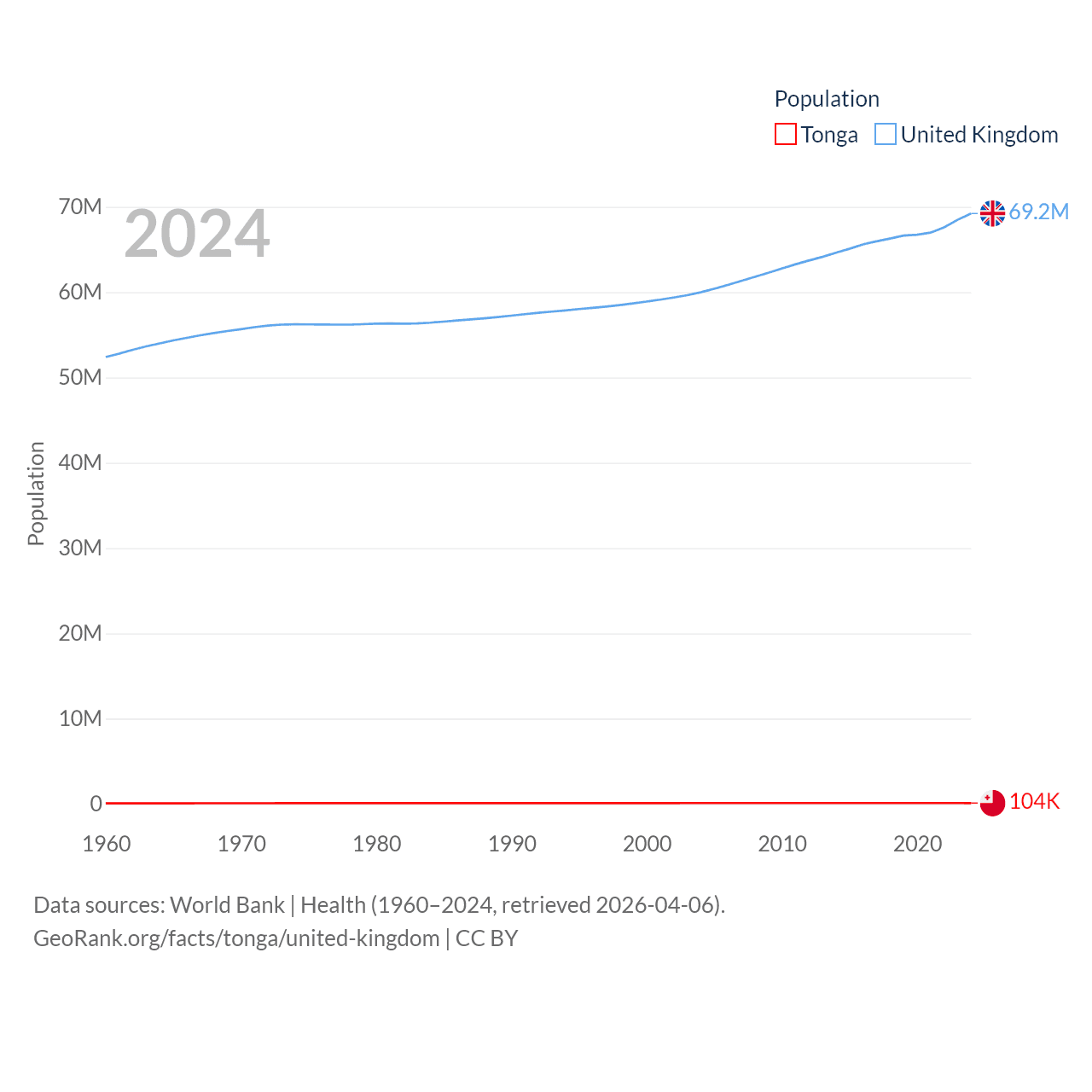 Tonga has a population of 104K (ranked 183/197), compared with 69.2M in The United Kingdom (ranked 21/197). Tonga's land area is 278 sq mi versus 93,410 sq mi for The United Kingdom (ranked 176th vs. 78th).