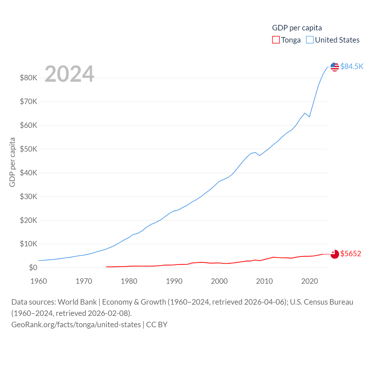 By GDP, Tonga ranks 191/197 ($591M) and The United States ranks 1/197 ($28.8T). By GDP per capita, Tonga ranks 115/197 ($5,652), while The United States ranks 10/197 ($84,534).