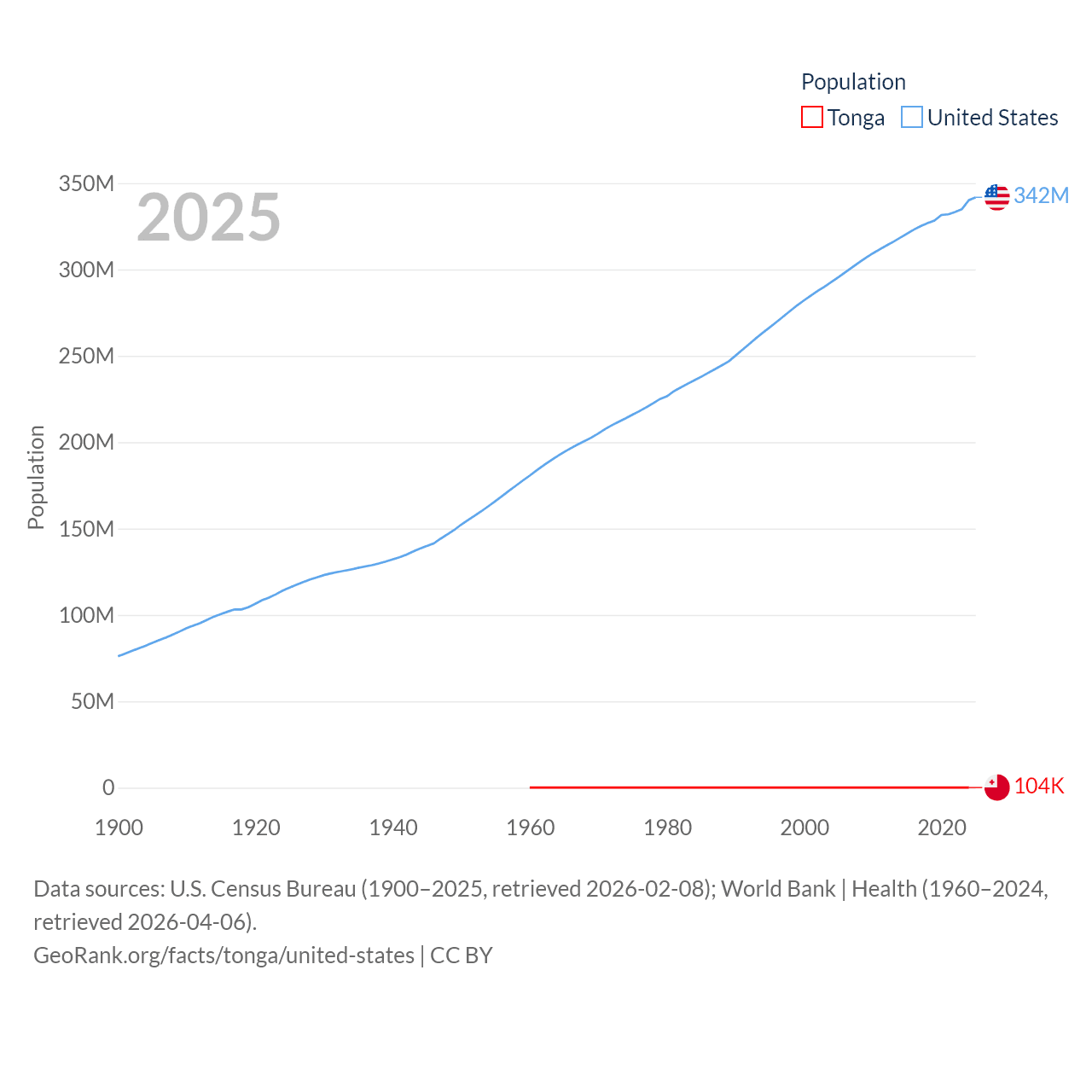 Tonga has a population of 104K (ranked 183/197), compared with 342M in The United States (ranked 3/197). Tonga's land area is 278 sq mi versus 3,531,839 sq mi for The United States (ranked 176th vs. 3rd).