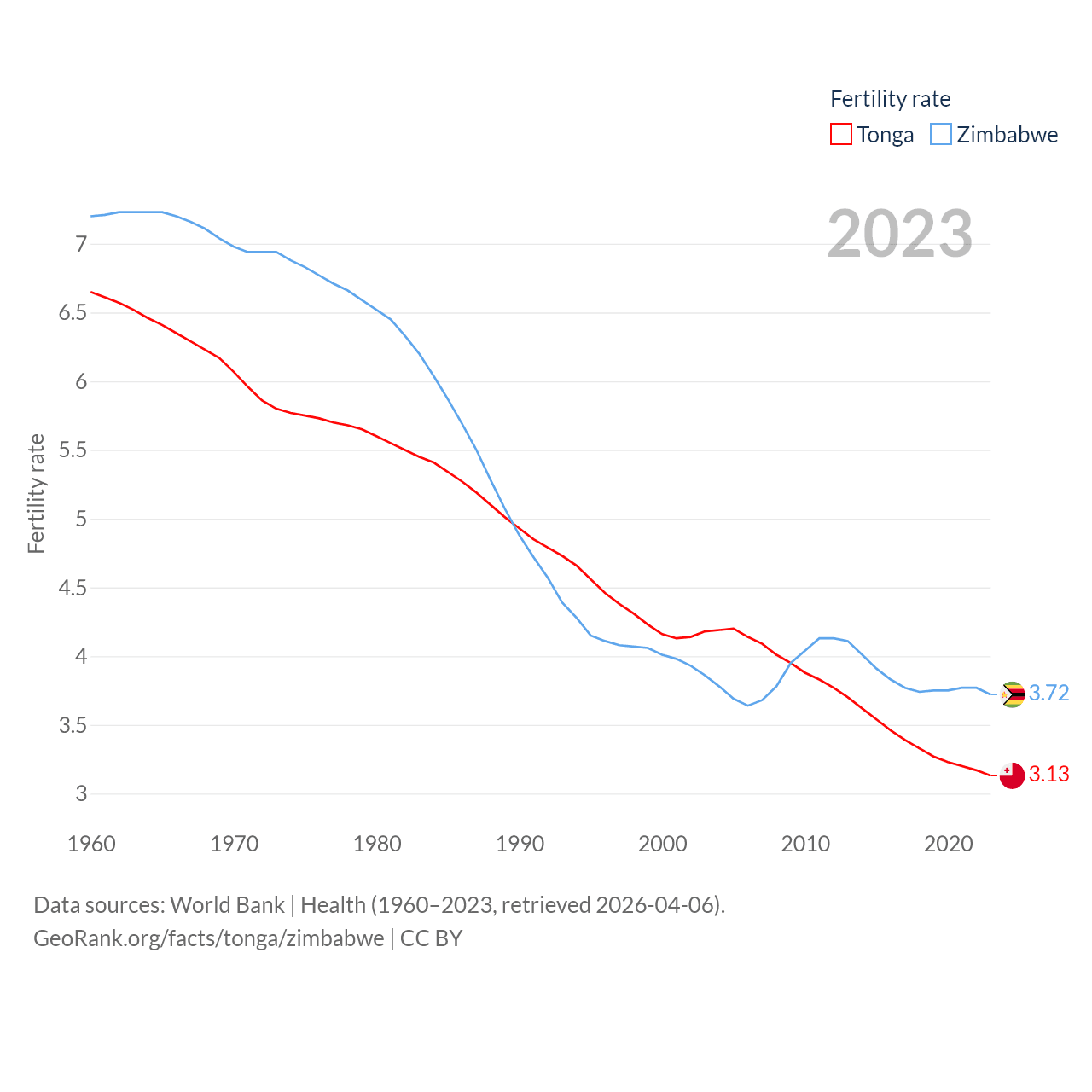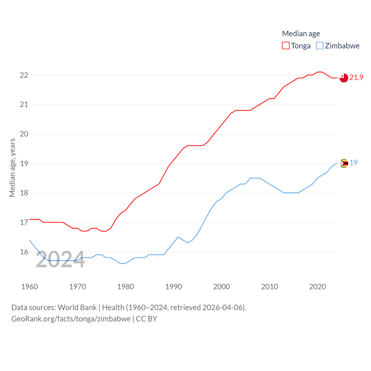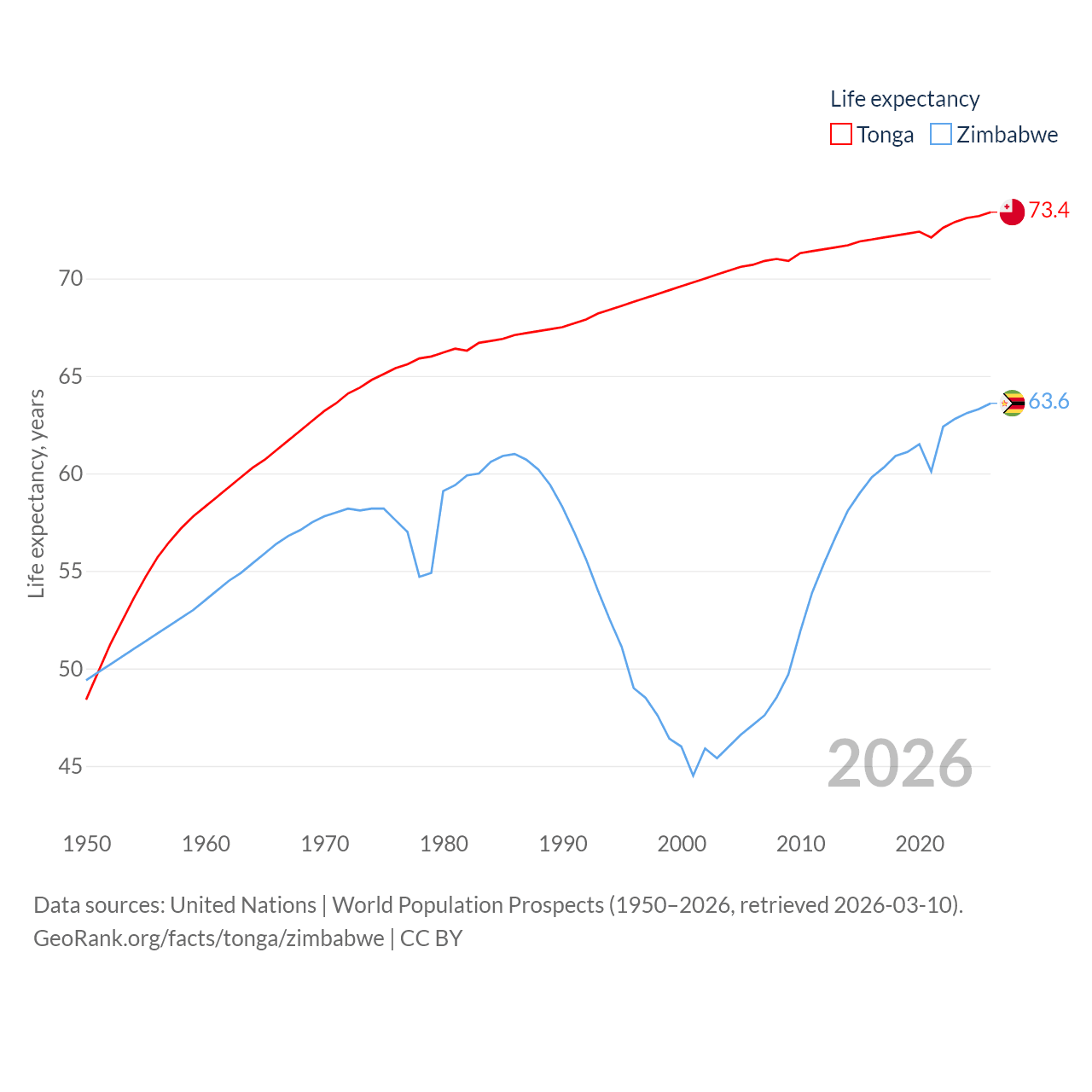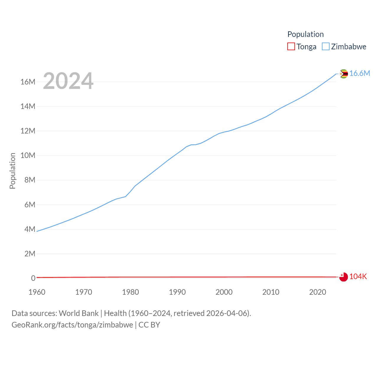Tonga has a population of 104K (ranked 183/197), compared with 16.6M in Zimbabwe (ranked 74/197). Tonga's land area is 278 sq mi versus 149,364 sq mi for Zimbabwe (ranked 176th vs. 60th).