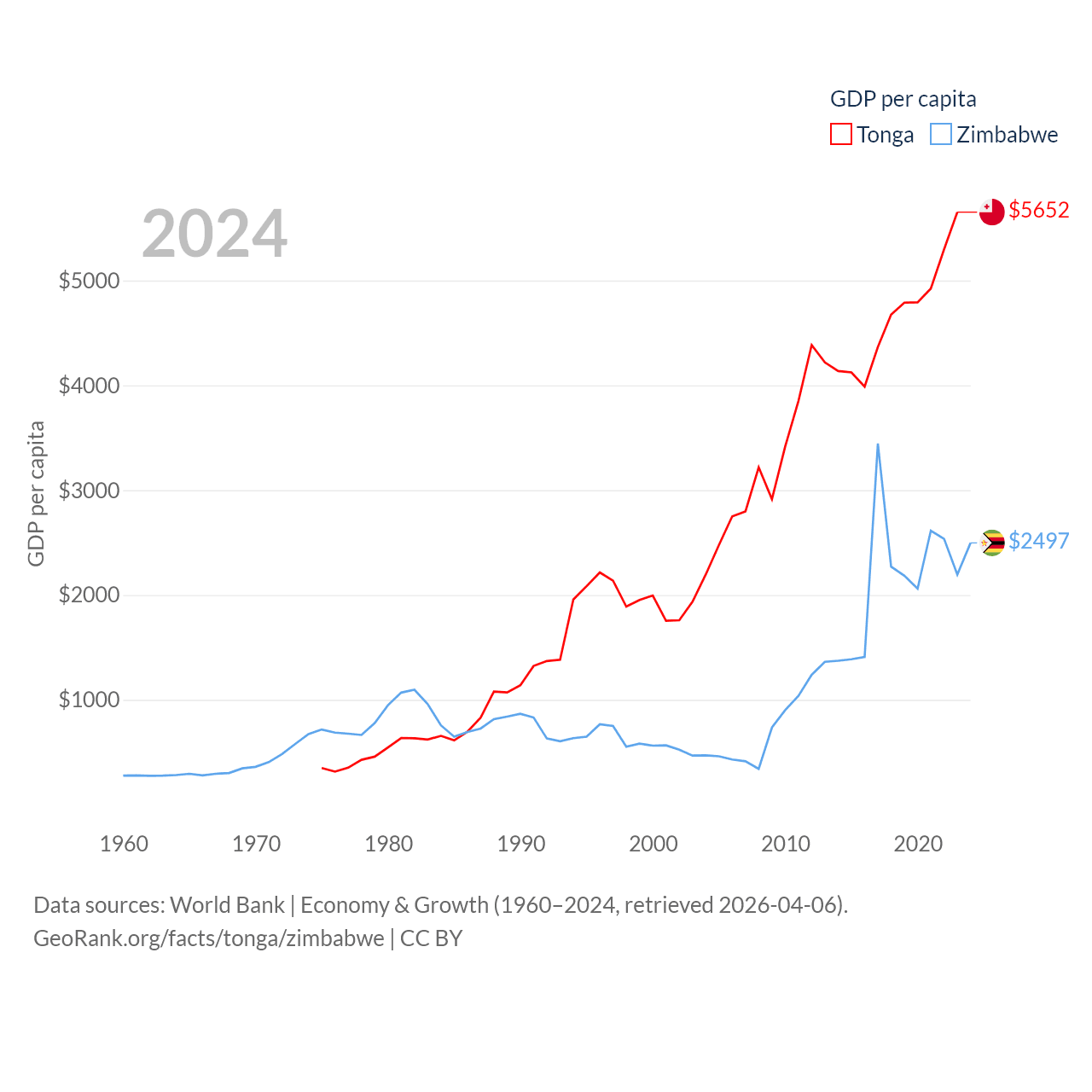 By GDP, Tonga ranks 191/197 ($591M) and Zimbabwe ranks 102/197 ($41.5B). By GDP per capita, Tonga ranks 115/197 ($5,652), while Zimbabwe ranks 148/197 ($2,497).
