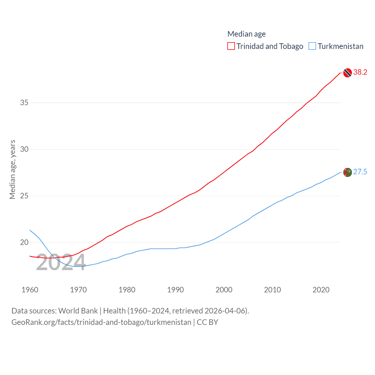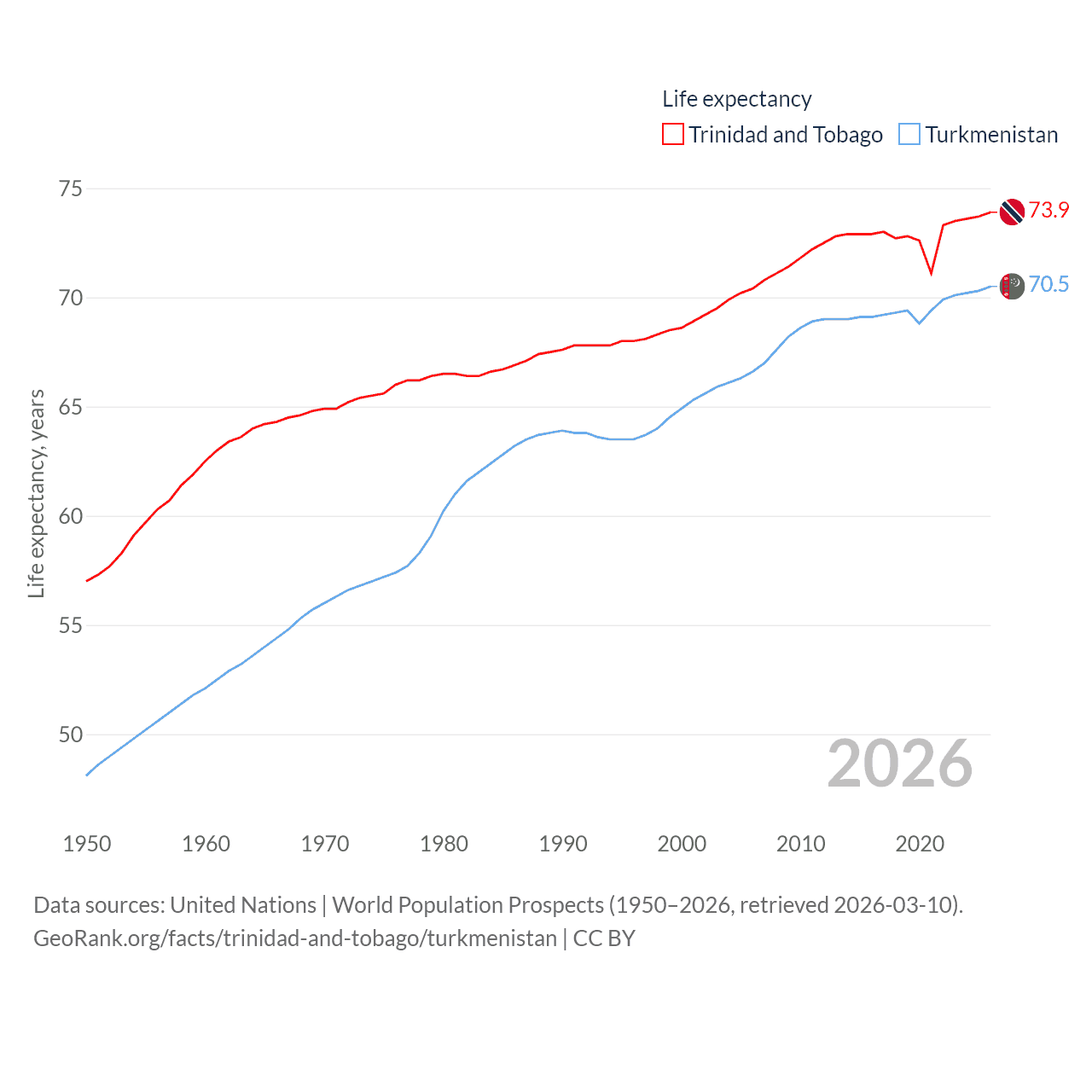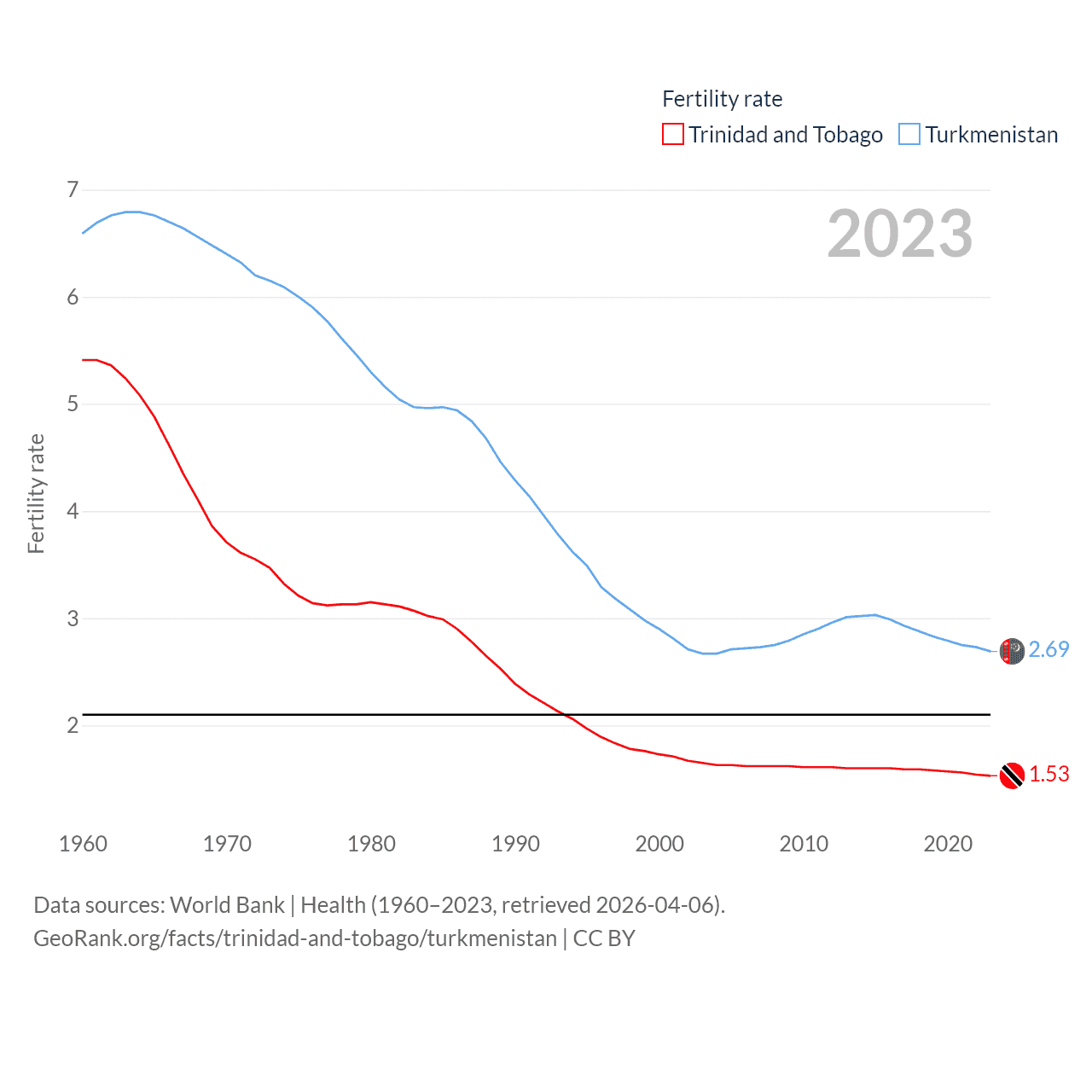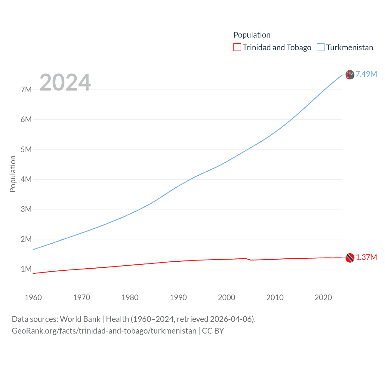 Trinidad and Tobago has a population of 1.37M (ranked 154/197), compared with 7.49M in Turkmenistan (ranked 104/197). Trinidad and Tobago's land area is 1,981 sq mi versus 181,441 sq mi for Turkmenistan (ranked 166th vs. 53rd).