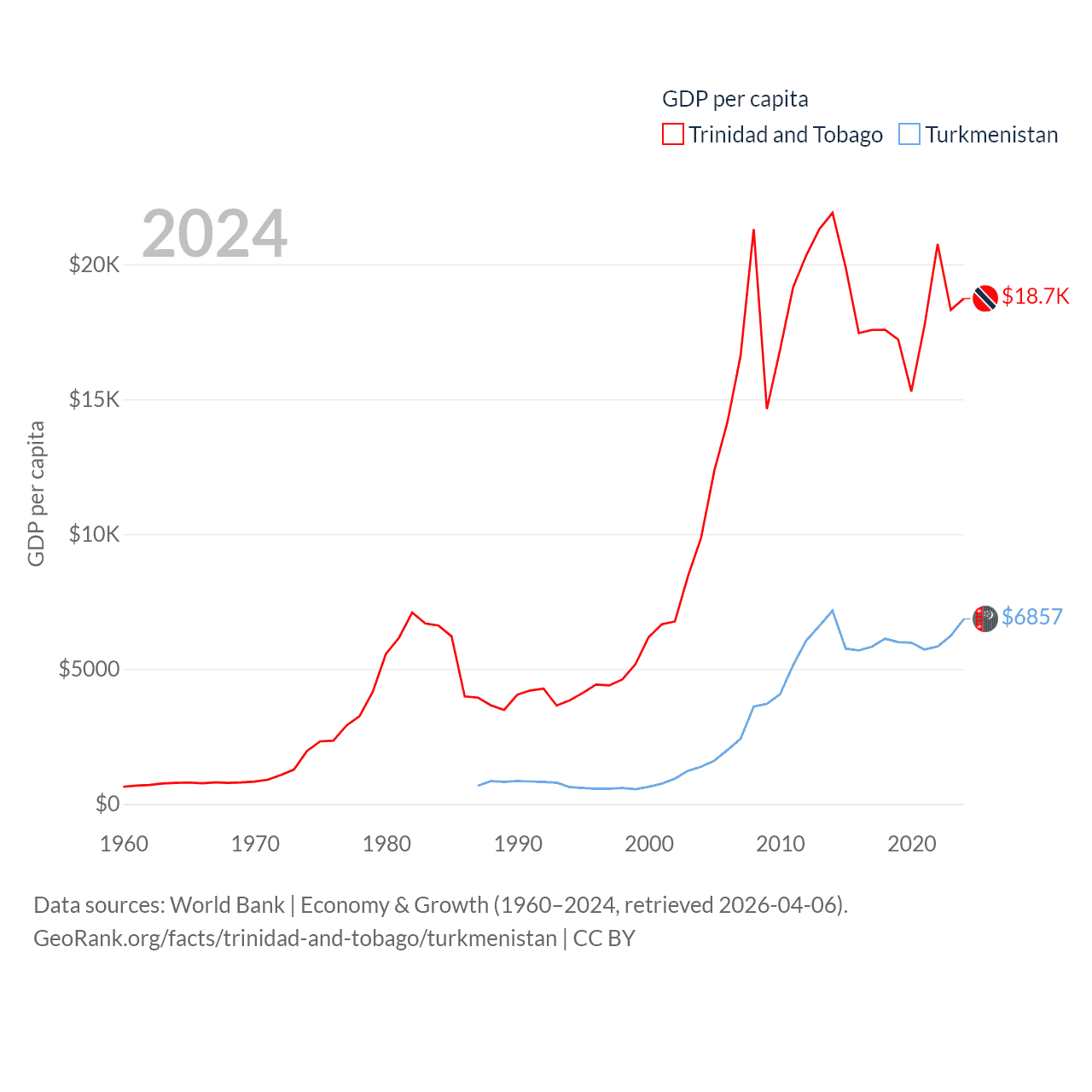 By GDP, Trinidad and Tobago ranks 115/197 ($25.6B) and Turkmenistan ranks 92/197 ($51.4B). By GDP per capita, Trinidad and Tobago ranks 61/197 ($18,733), while Turkmenistan ranks 104/197 ($6,857).
