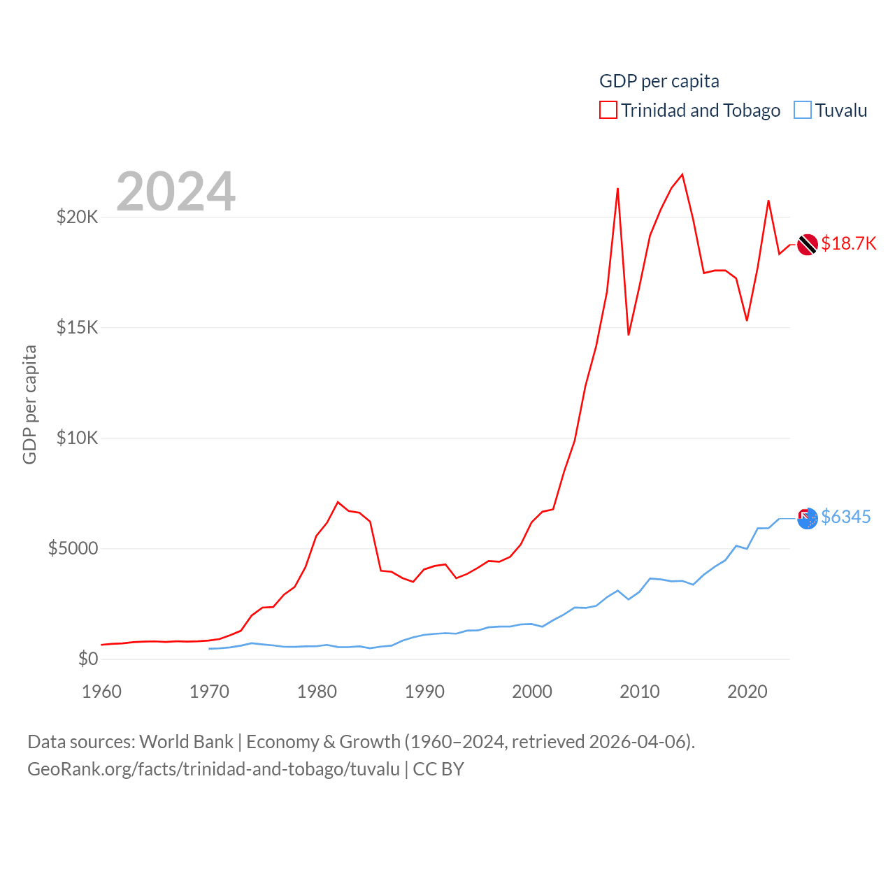 By GDP, Trinidad and Tobago ranks 115/197 ($25.6B) and Tuvalu ranks 196/197 ($62.3M). By GDP per capita, Trinidad and Tobago ranks 61/197 ($18,733), while Tuvalu ranks 110/197 ($6,345).