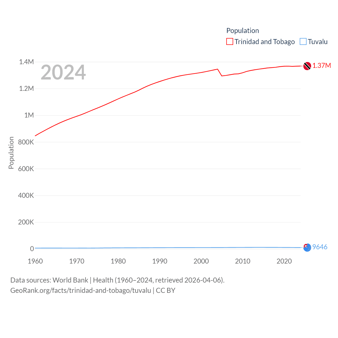 Trinidad and Tobago has a population of 1.37M (ranked 154/197), compared with 9.65K in Tuvalu (ranked 196/197). Trinidad and Tobago's land area is 1,981 sq mi versus 11.6 sq mi for Tuvalu (ranked 166th vs. 194th).