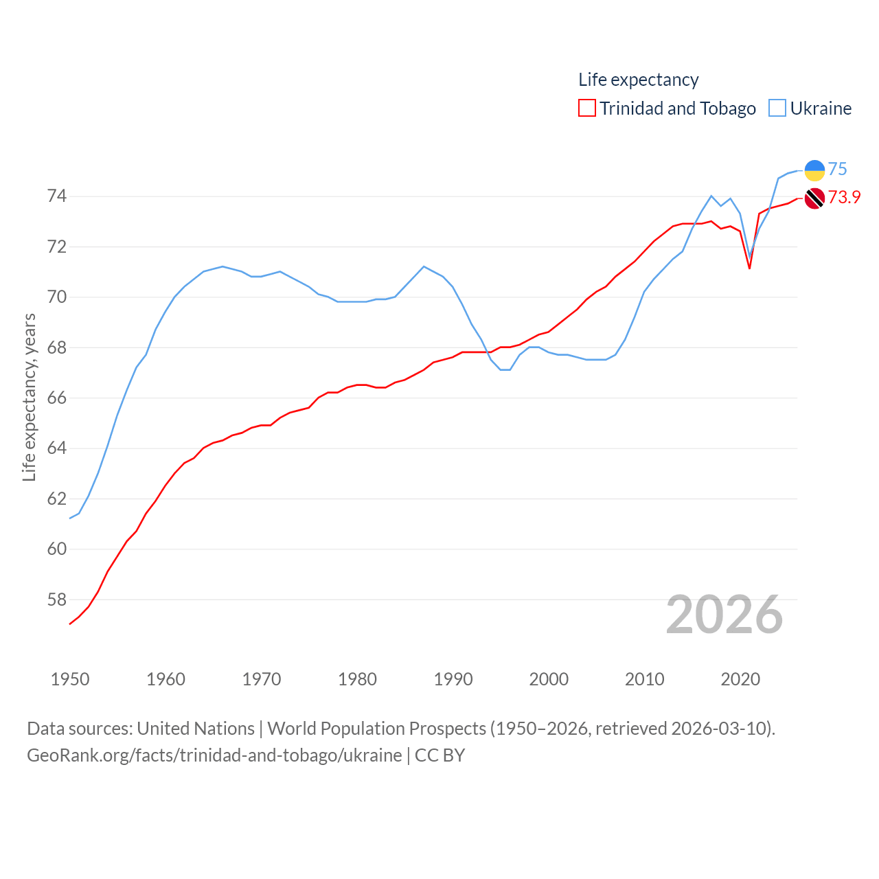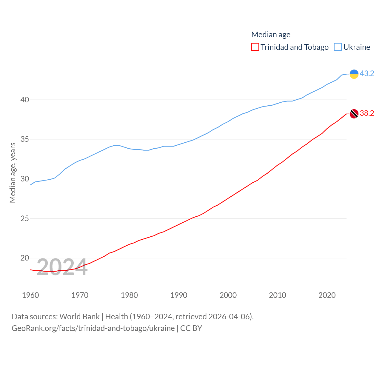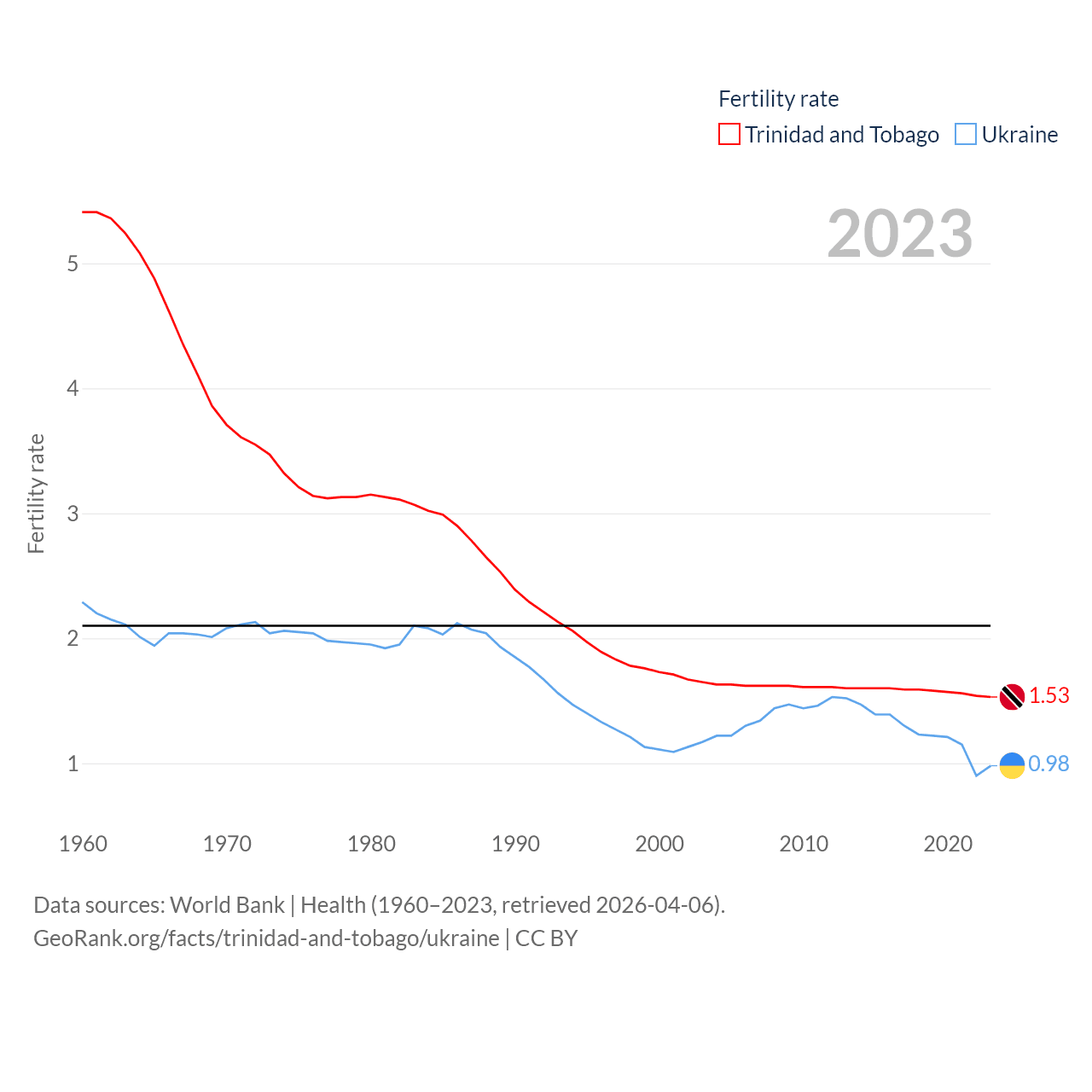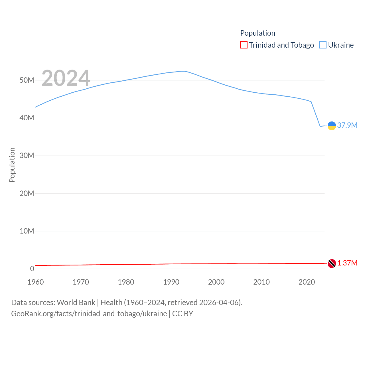 Trinidad and Tobago has a population of 1.37M (ranked 154/197), compared with 37.9M in Ukraine (ranked 41/197). Trinidad and Tobago's land area is 1,981 sq mi versus 223,708 sq mi for Ukraine (ranked 166th vs. 46th).