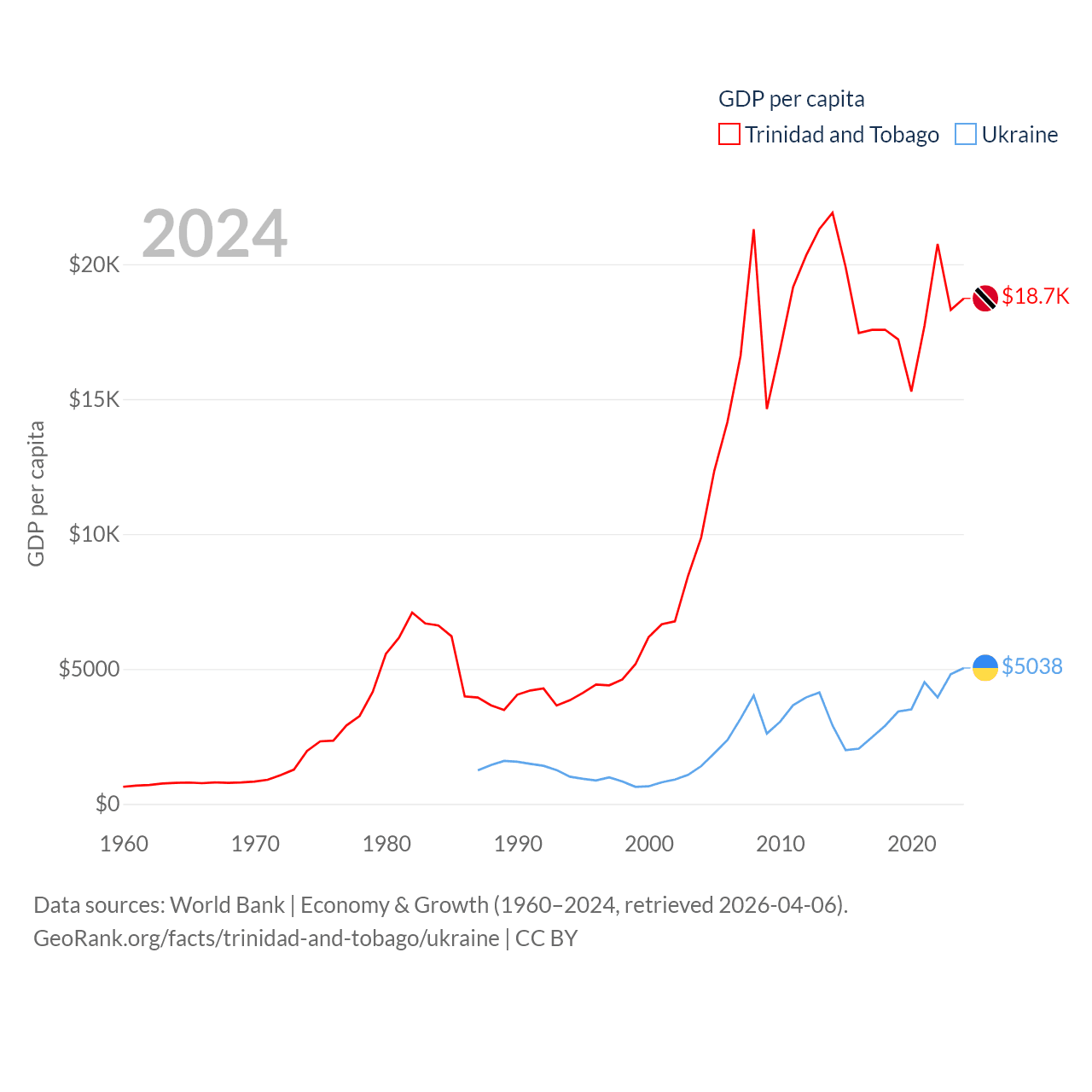 By GDP, Trinidad and Tobago ranks 115/197 ($25.6B) and Ukraine ranks 57/197 ($191B). By GDP per capita, Trinidad and Tobago ranks 61/197 ($18,733), while Ukraine ranks 120/197 ($5,038).