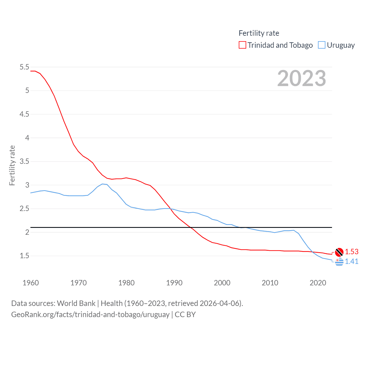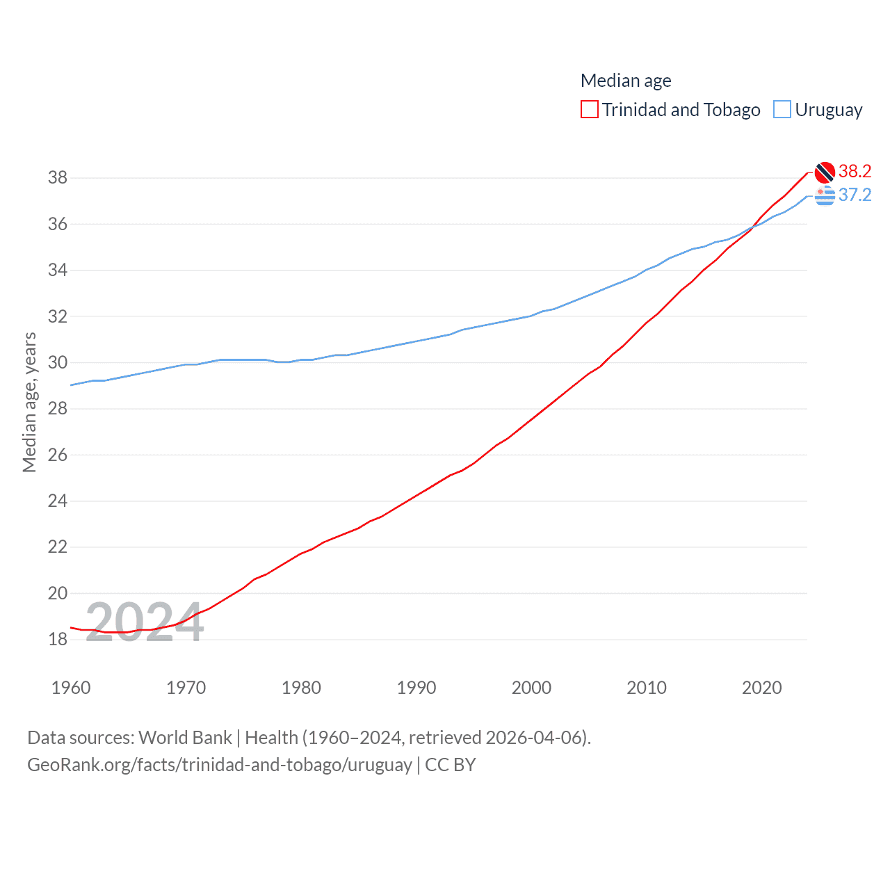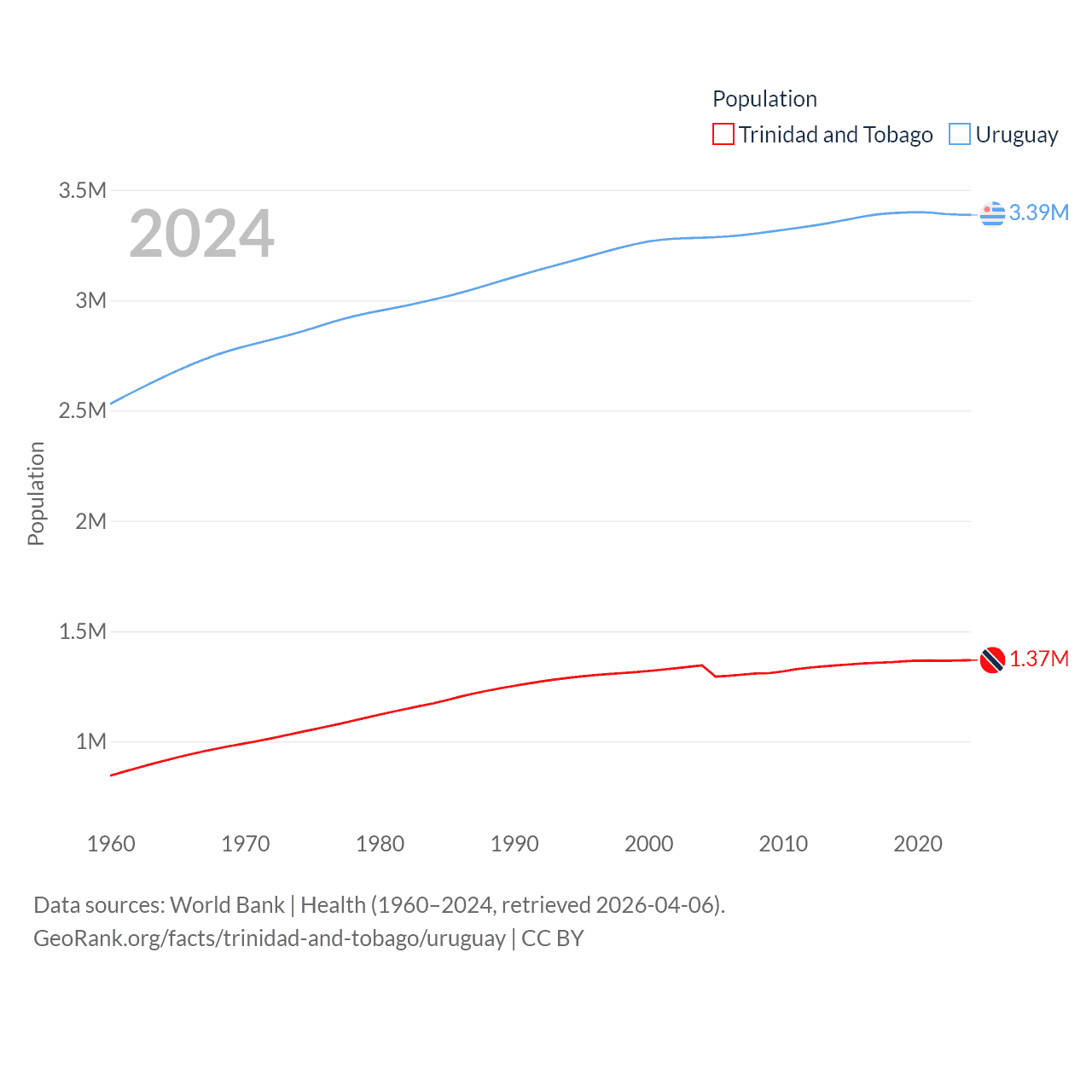 Trinidad and Tobago has a population of 1.37M (ranked 154/197), compared with 3.39M in Uruguay (ranked 133/197). Trinidad and Tobago's land area is 1,981 sq mi versus 67,576 sq mi for Uruguay (ranked 166th vs. 89th).