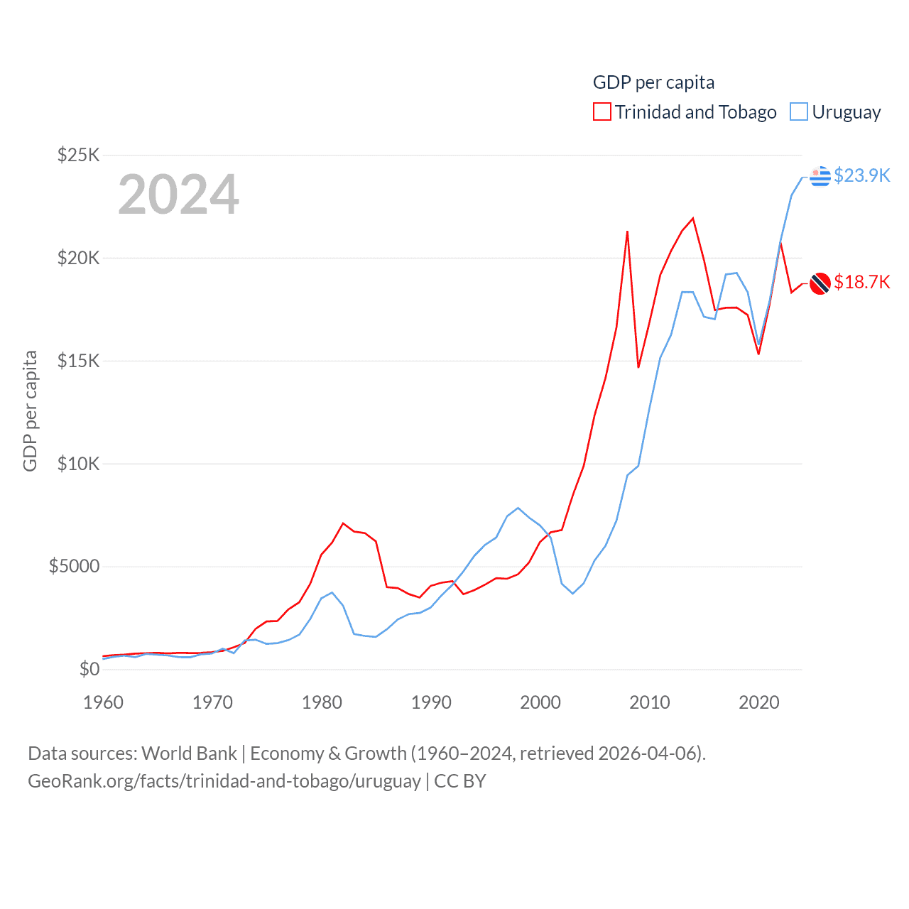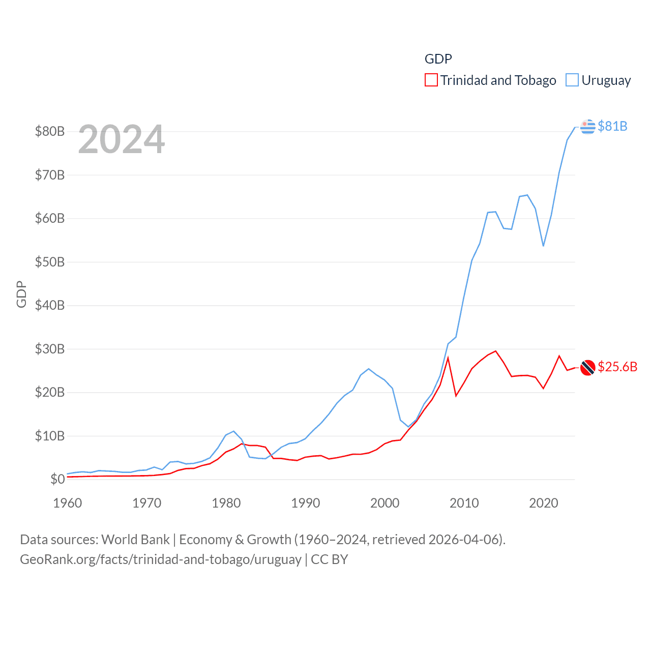 By GDP, Trinidad and Tobago ranks 115/197 ($25.6B) and Uruguay ranks 81/197 ($81B). By GDP per capita, Trinidad and Tobago ranks 61/197 ($18,733), while Uruguay ranks 52/197 ($23,907).